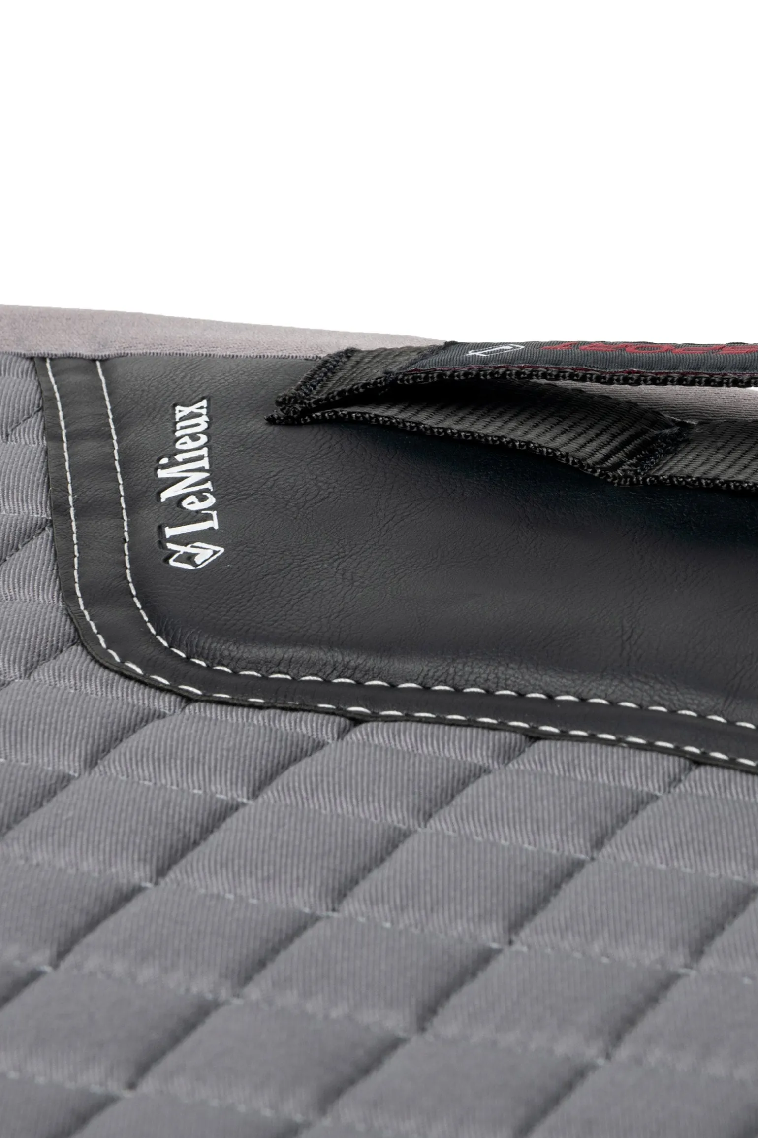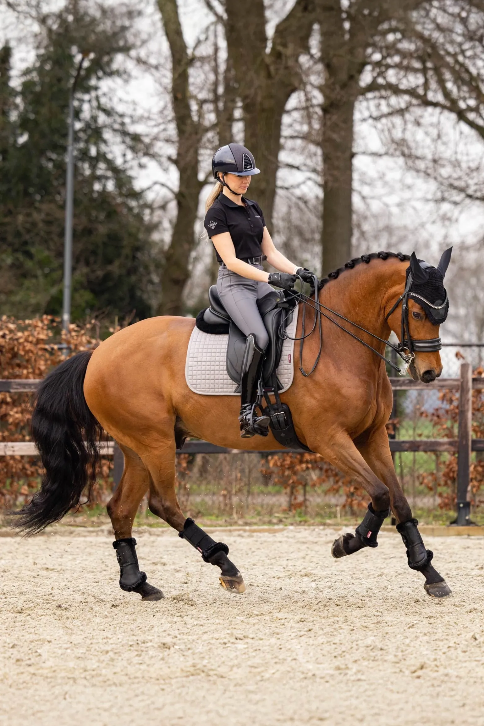 Modisches und strapazierfähiges Pad für maximale Leistung des Materials, für das tägliche Training oder Turniereinsätze geeignet. Premium Baumwolle außen und Fütterung für Temperaturregelung und Atmungsaktivität. Klassischer Dressur-Schnitt mit hohem Widerrist, elastischen D-Ringen & Gurt-Schutz mit innen versteckten Schlaufen um ein Rutschen zu verhindern. Gut in der Maschine zu waschen.