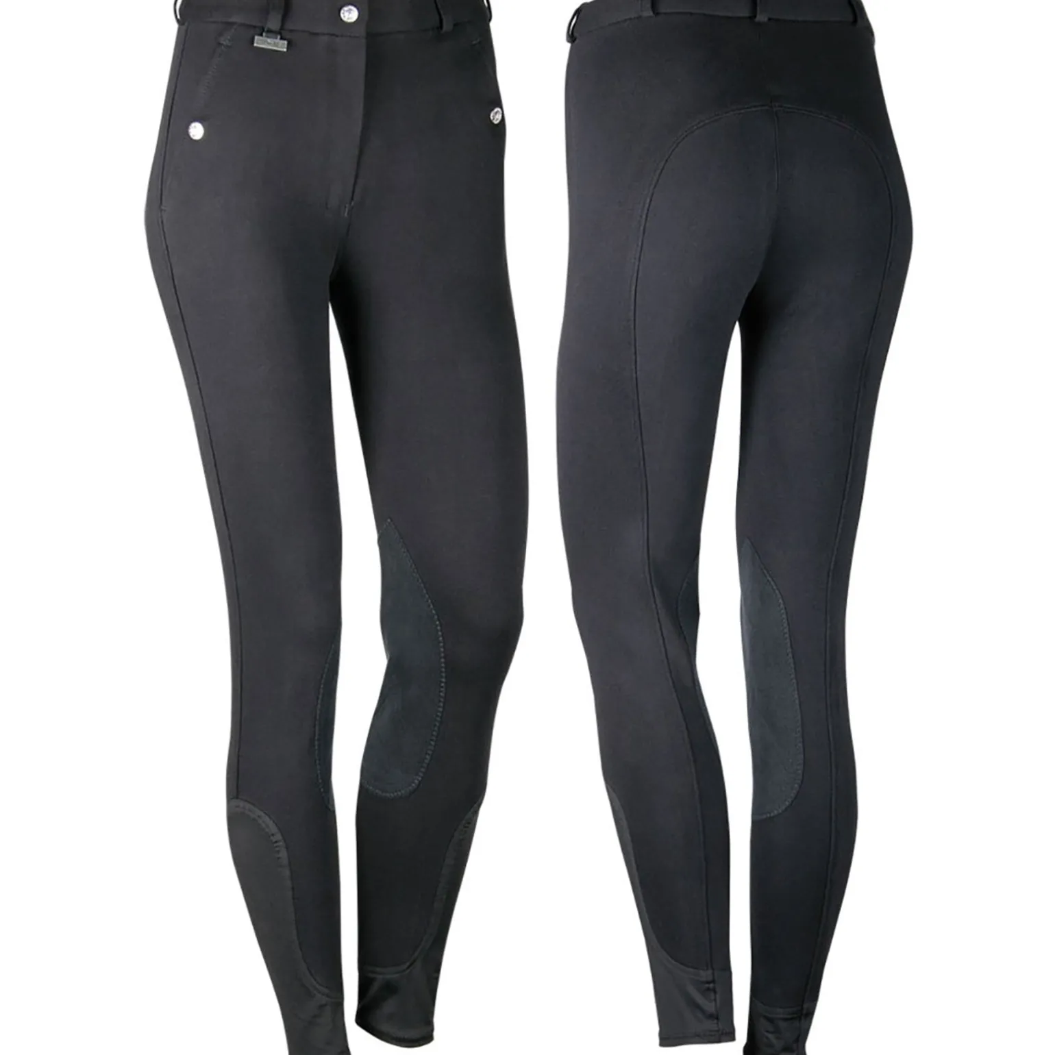 Reithose mit Schiebeverschluss, Reißverschluss, Druckknopftaschen, Gürtelschlaufen und elastischem Beinabschluss aus Lycra.