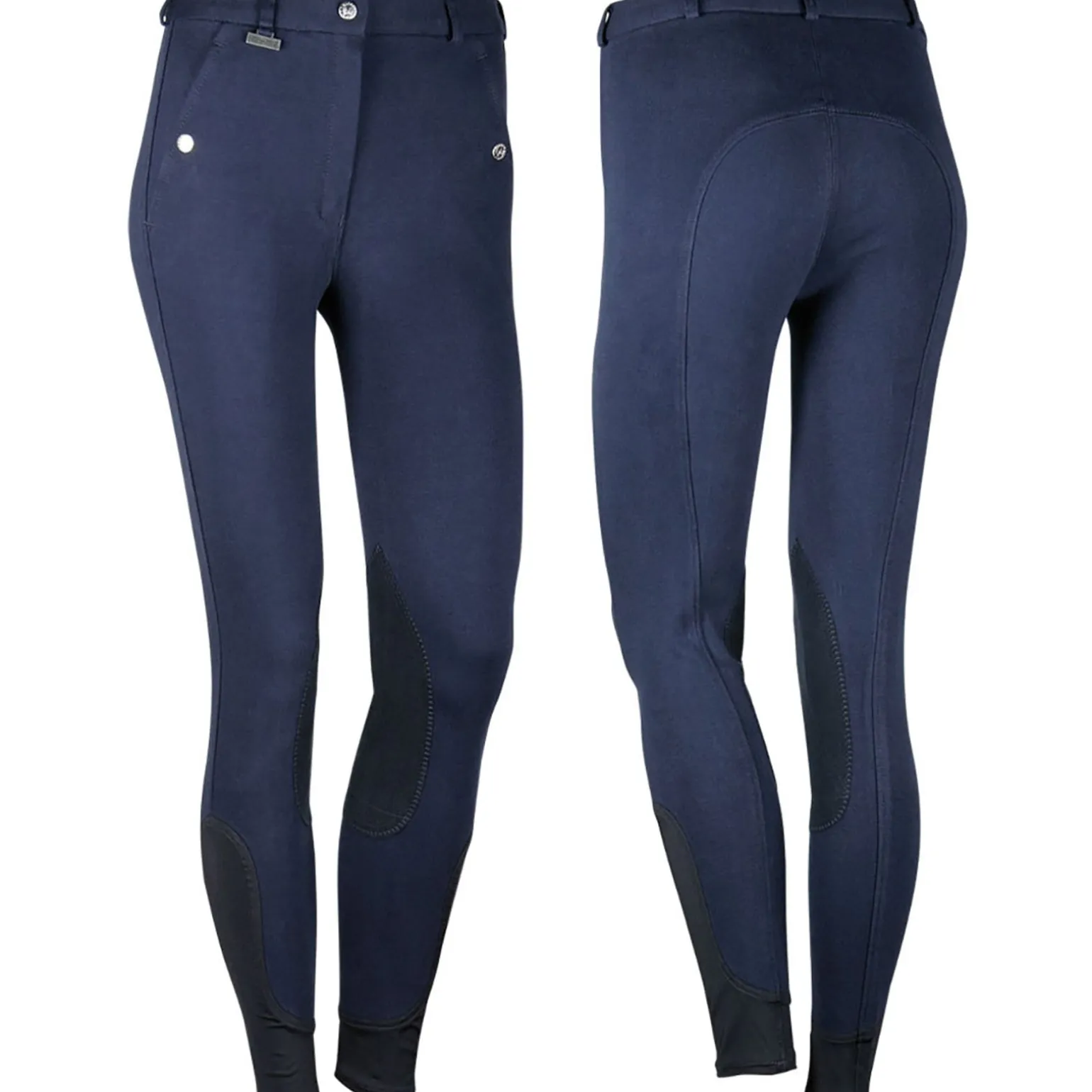 Reithose mit Schiebeverschluss, Reißverschluss, Druckknopftaschen, Gürtelschlaufen und elastischem Beinabschluss aus Lycra.