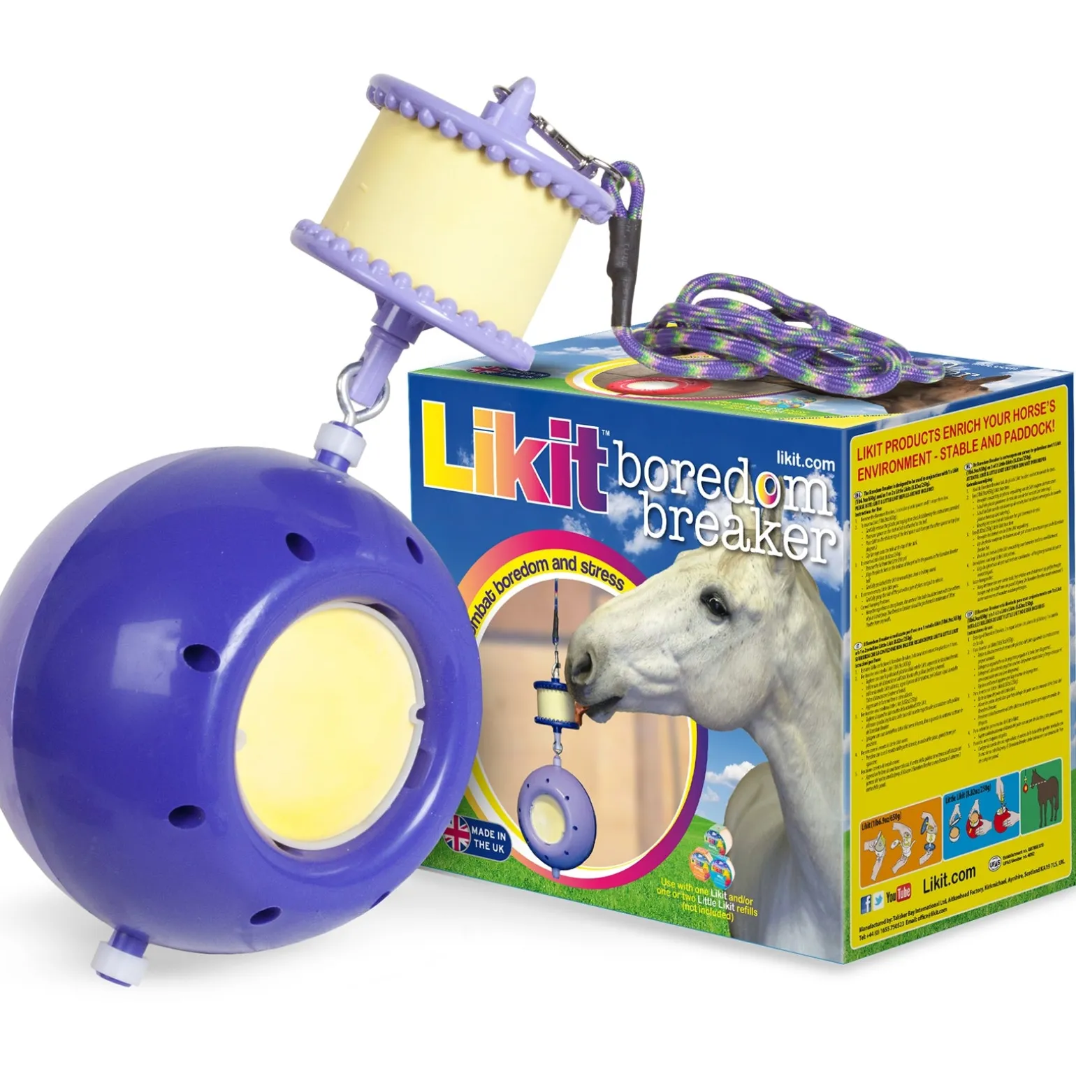 Pfiffige Kombination aus Lecksteinhalter und Spielball, die einfach in der Box oder auf dem Paddock aufgehängt werden kann. Zur sinnvollen Beschäftigung des Pferdes – zur Verminderung von Langeweile und Stress. Geeignet für zwei Likits à 250 g und einen Likit à 650 g. Lieferung erfolgt ohne Lecksteine!