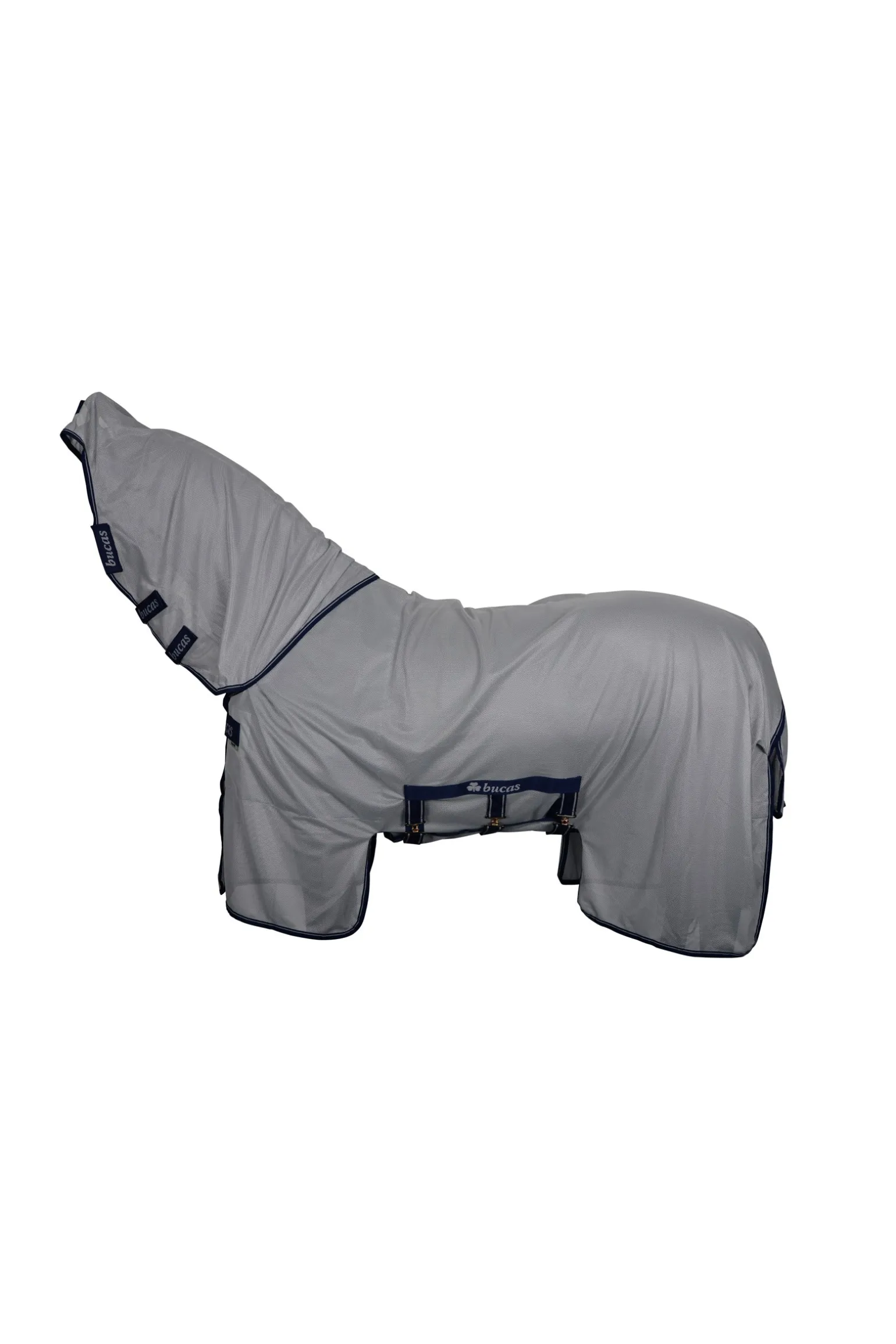 Die Decke besteht aus einem speziellen, extra feinmaschigen und leichten Mesh-Gewebe, das hilft, Fliegen abzuhalten und gleichzeitig vor dem Ausbleichen durch die Sonne schützt. Die extra langen Seiten der Decke helfen, Fliegen fernzuhalten und fördern außerdem die Luftzirkulation um die Beine des Pferdes. Die Decke wird um den Bauch des Pferdes gewickelt und schützt so diesen Bereich vor Fliegen. Die drei Gurtbänder halten die Decke an ihrem Platz. Es ist eine großartige Decke für Hengste und Pferderassen, die zu einer breiteren Schulterpartie neigen, wie Friesen, Andalusier und Zugpferde.