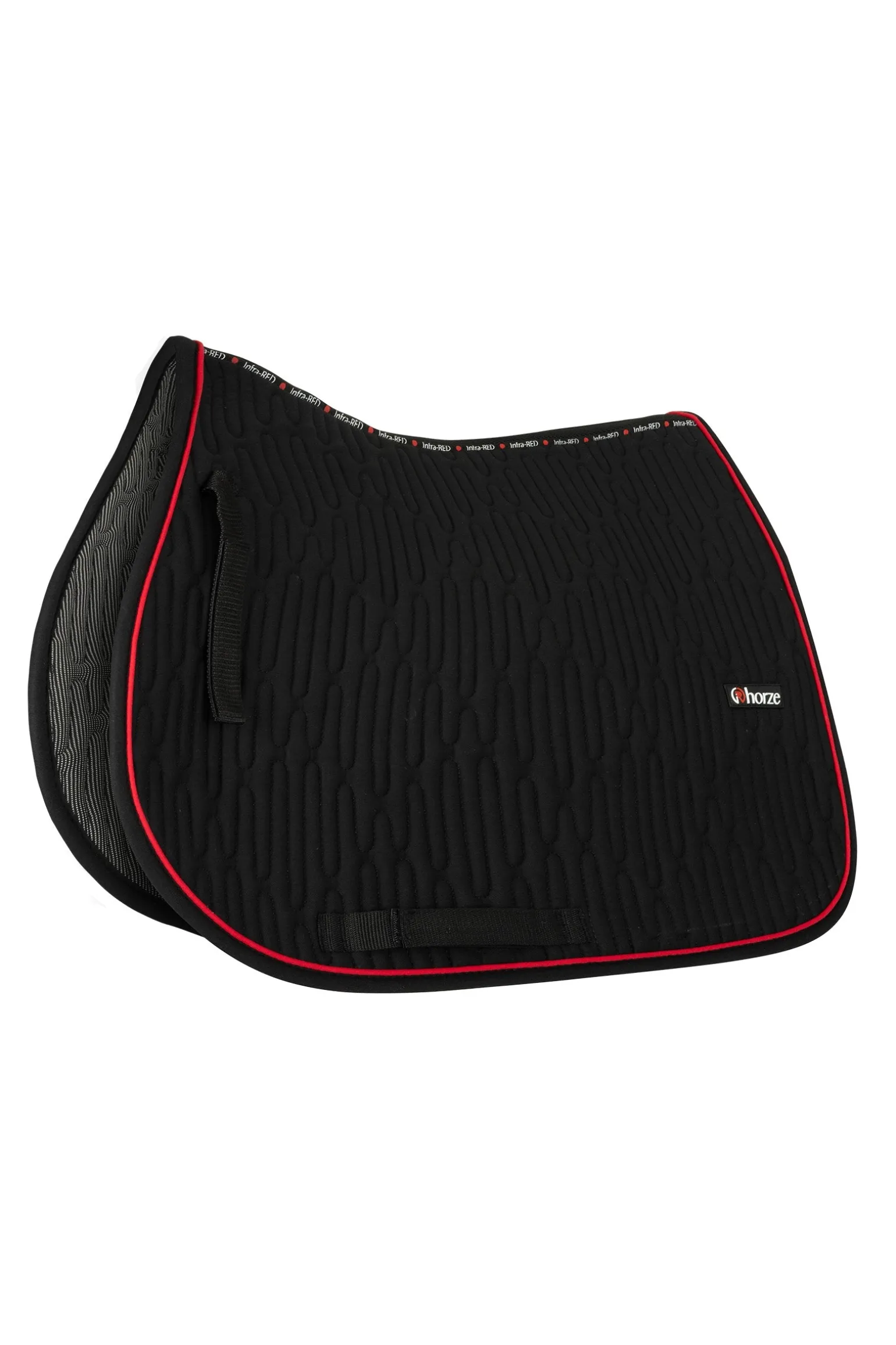 Mesh entlang der Wirbelsäule erhöht die Atmungsaktivität unter dem Sattel, was bei schweißtreibenden Trainingseinheiten oder an heißen Sommertagen sehr praktisch ist. Lange Sattelbefestigungen und zu öffnende Gurtschlaufen halten den Sattel sicher an seinem Platz. Rote Paspeln und Logotape entlang des Mesheinsatzes kennzeichnen diese Schabracke als Teil der Horze Cairo Kollektion.