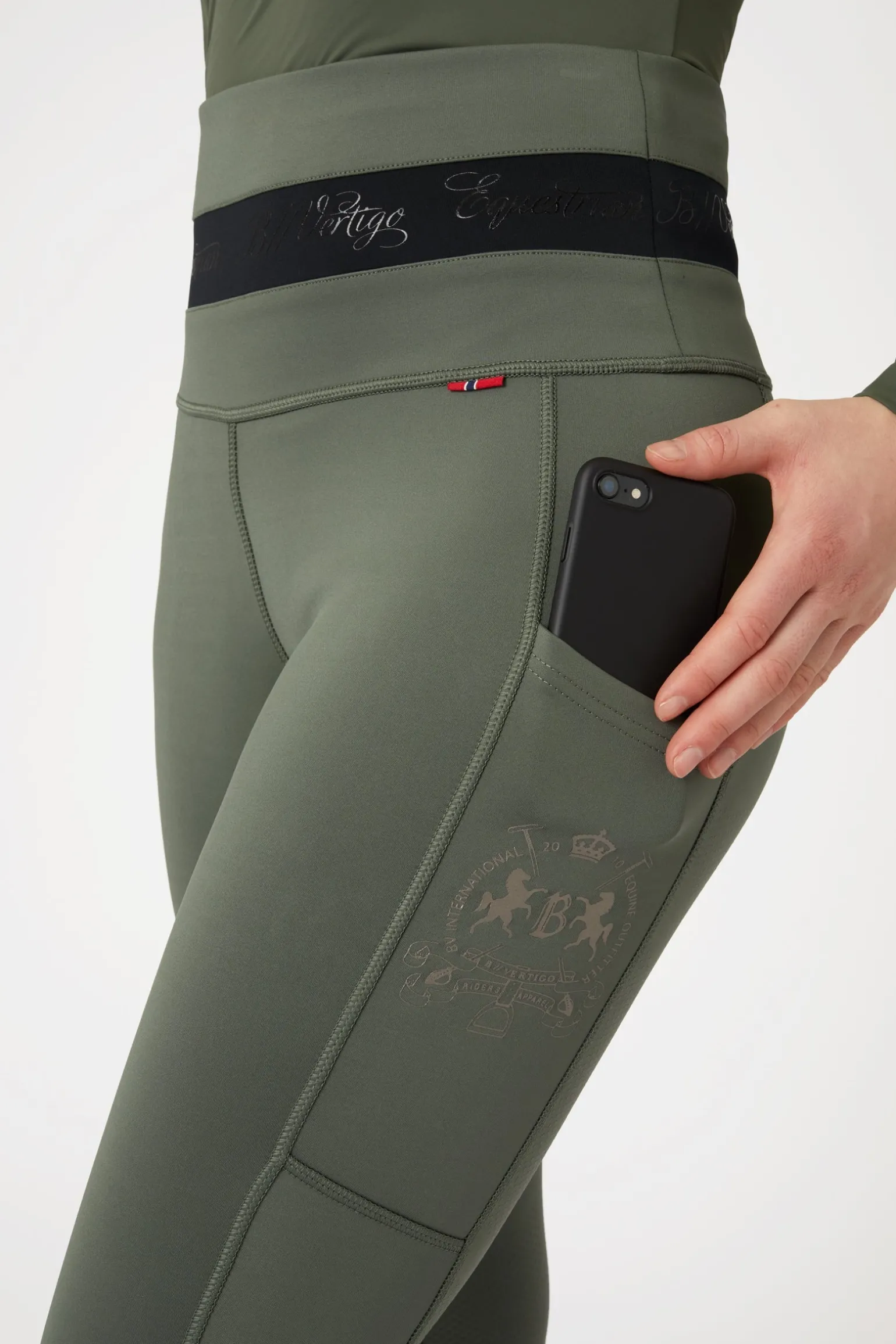 Diese raffinierte Reitleggings zaubert eine außergewöhnlich feminine Silhouette! Mit ihrem atmungsaktiven, superweichen und dehnbaren, schmutzabweisenden Scuba-Stoff sind sie äußerst angenehm zu tragen. Der breite, hoch geschnittene Bund ist mit einem auffälligen B Vertigo-Logo-Tape versehen und ein verstellbarer Kordelzug im Inneren des Bundes ermöglicht den perfekten Sitz dieser Reitleggings. An beiden Oberschenkeln befinden sich Handytaschen. Ein elegantes goldenes Logo auf der linken Tasche rundet das elegante und sportliche Design ab. Der Silikon-Vollgrip sorgt für einen festen Sitz im Sattel.