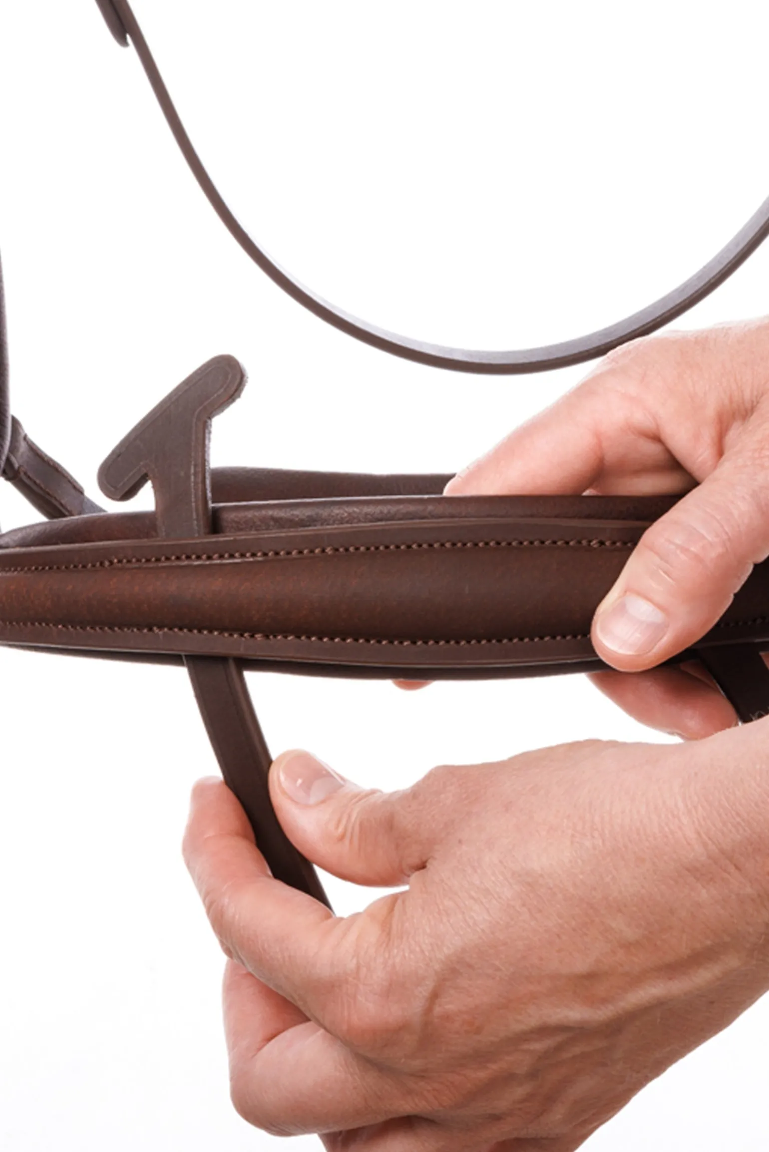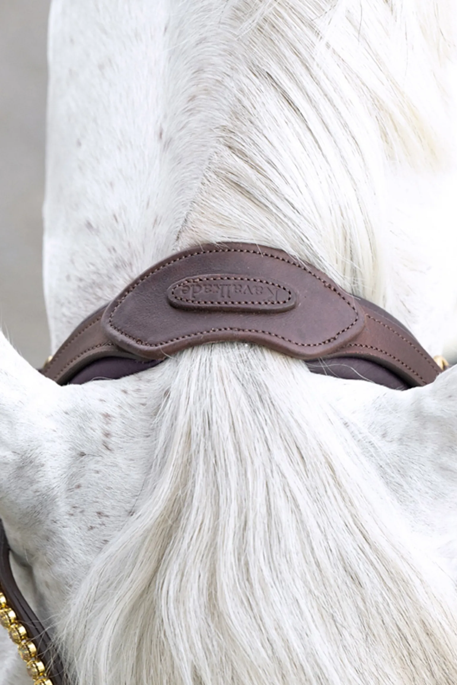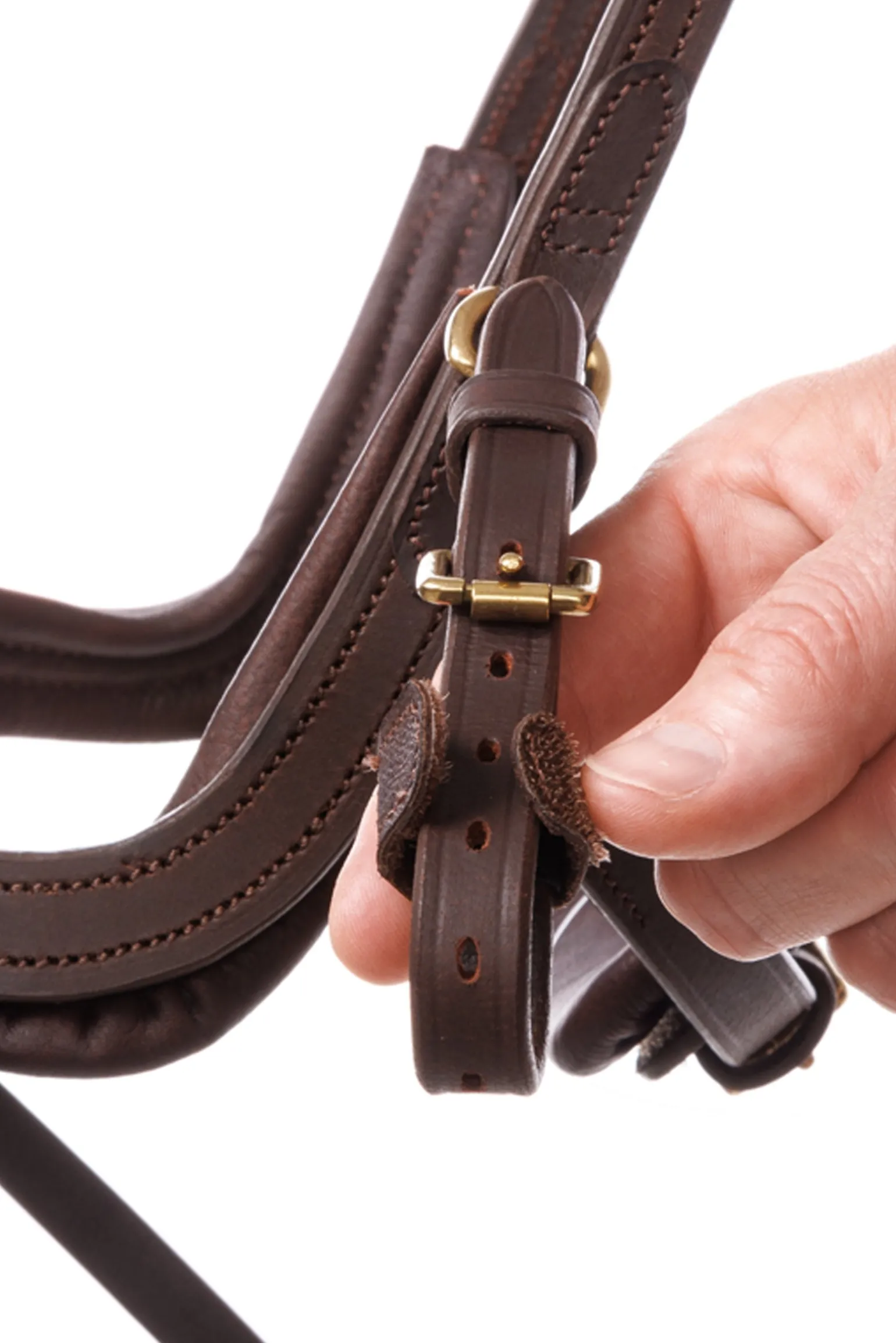 Bei Trensen mit dem Zusatz KavalSH4 ist der Sperrriemen abnehmbar. Das Besondere daran ist, dass die Halterung für den Sperrriemen nicht, wie bei herkömmlichen Trensen mit abnehmbarem Sperrriemen, ersichtlich ist.