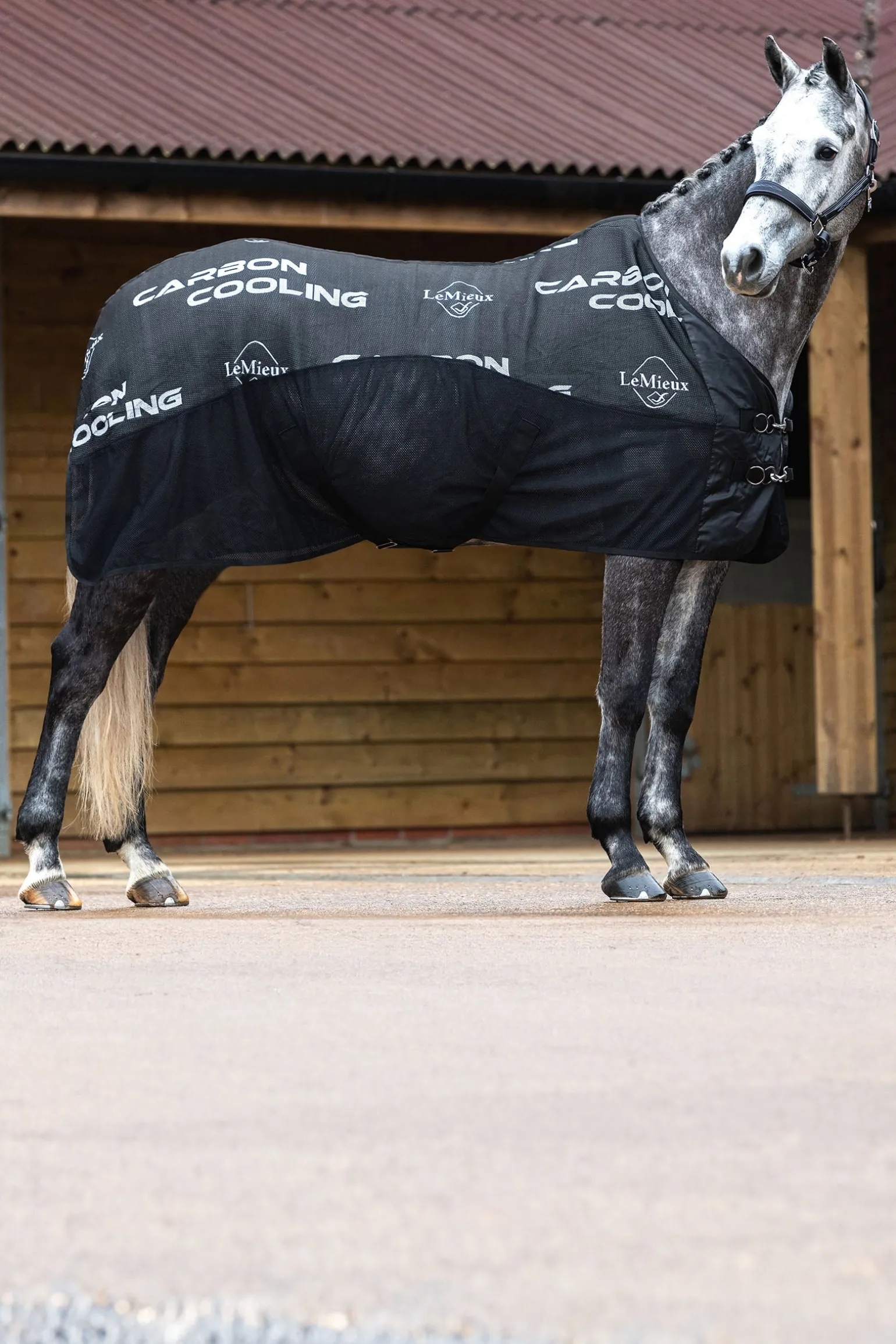 Die Carbon Cooler wird an der Brust mit zwei T-Bar-Verschlüssen befestigt, die auf verstellbaren Jacquard-Gurten montiert sind. Verstellbare Kreuzgurte und ein weicher Kordel-Schweifriemen sorgen dafür, dass die Decke eng am Pferdekörper anliegt und so die maximale Kühlwirkung erzielt wird.