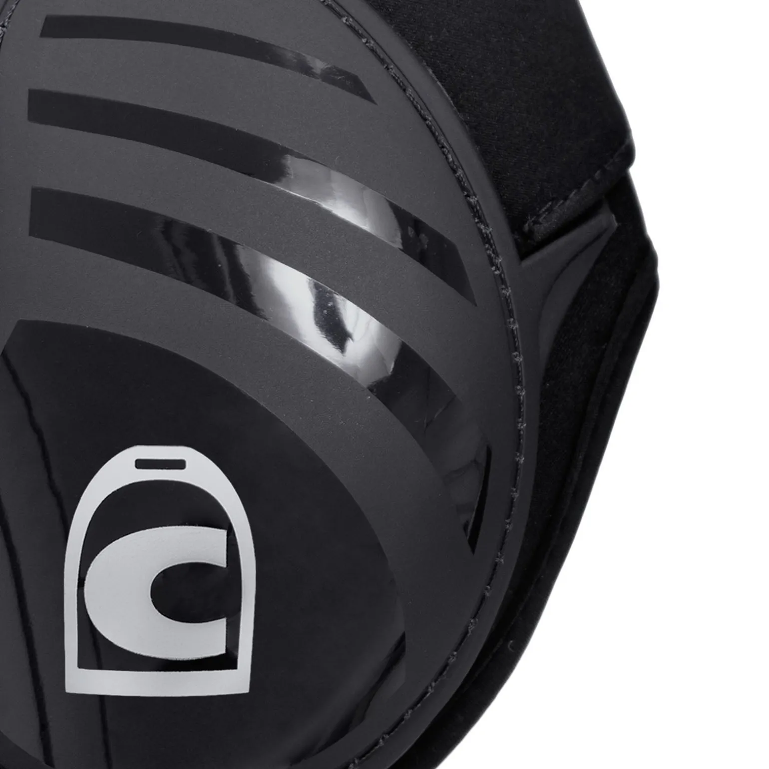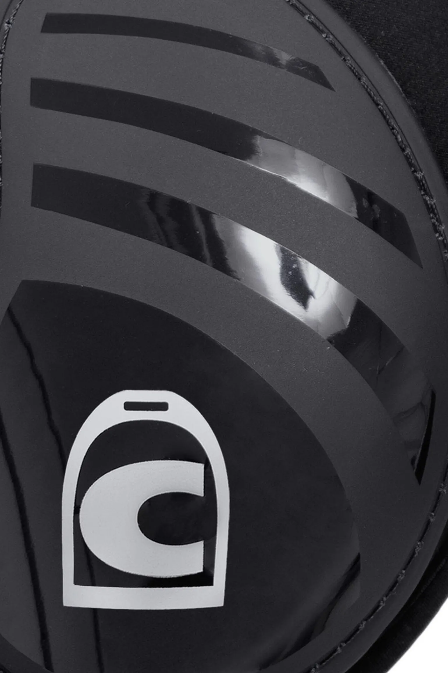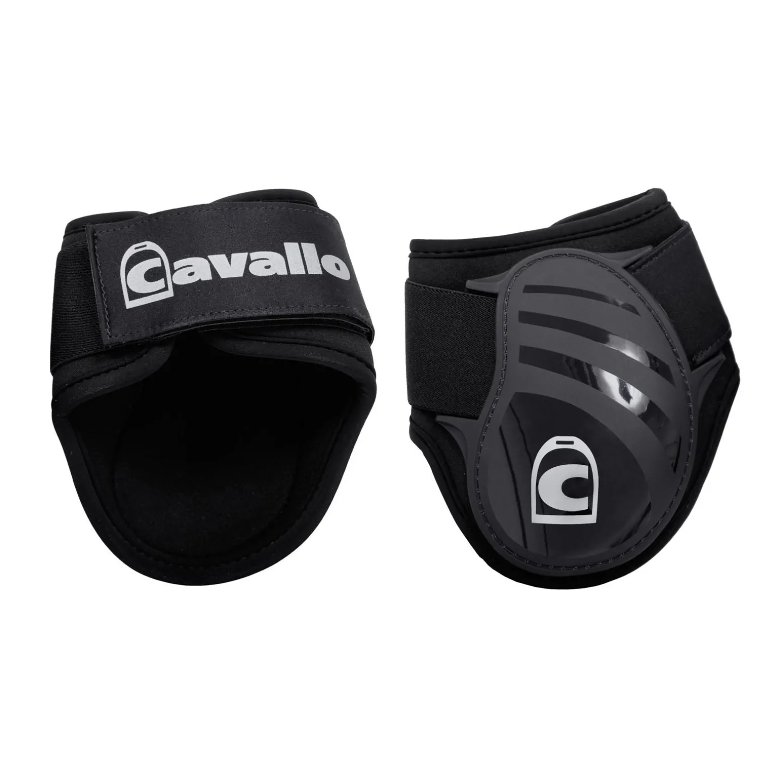 Strapazierfähige Hartschalen Streichkappen. Die Innenseite der Streichkappen sind mit angenehmem Neopren gefüttert. Die Streichkappen sind mit einem breiten Gummiband und Flauschband zum Verschließen an der Außenseite versehen. Fixiert werden die Bänder mit einem vertikalen Klettband. Auf der Oberseite des Klettbandes ist ein großes, silbernes Cavallo Logo aufgedruckt. Die Innenseite der Streichkappe ist mit einem großen Cavallo Steigbügel Logo bedruckt.