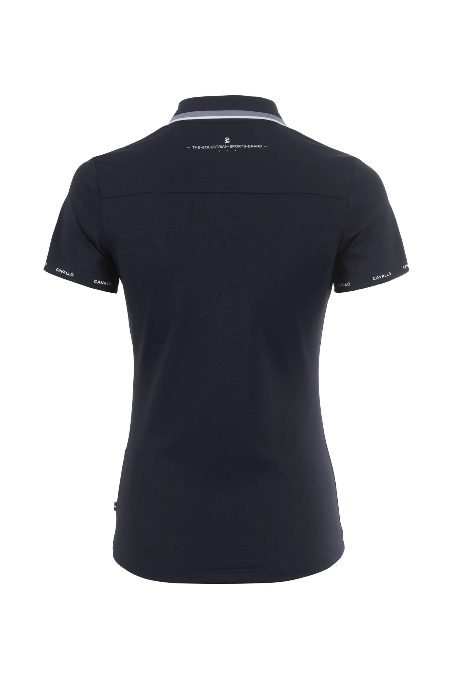 Sportliches Poloshirt mit V-Ausschnitt aus funktionellem Piqué. Gerippter Kragen mit Kontraststreifen am Rand sowie gerippter V-Ausschnitt mit verdeckter Knopfleiste und zwei weiteren Kontraststreifen. Ton-in-Ton gesticktes Cavallo-Sattelmotiv auf der linken Brust. Cavallo-Schriftzug in Weiß rund um die Ärmelsäume. Weißer Cavallo-Druck mit Kristallen mittig im Nackenbereich.