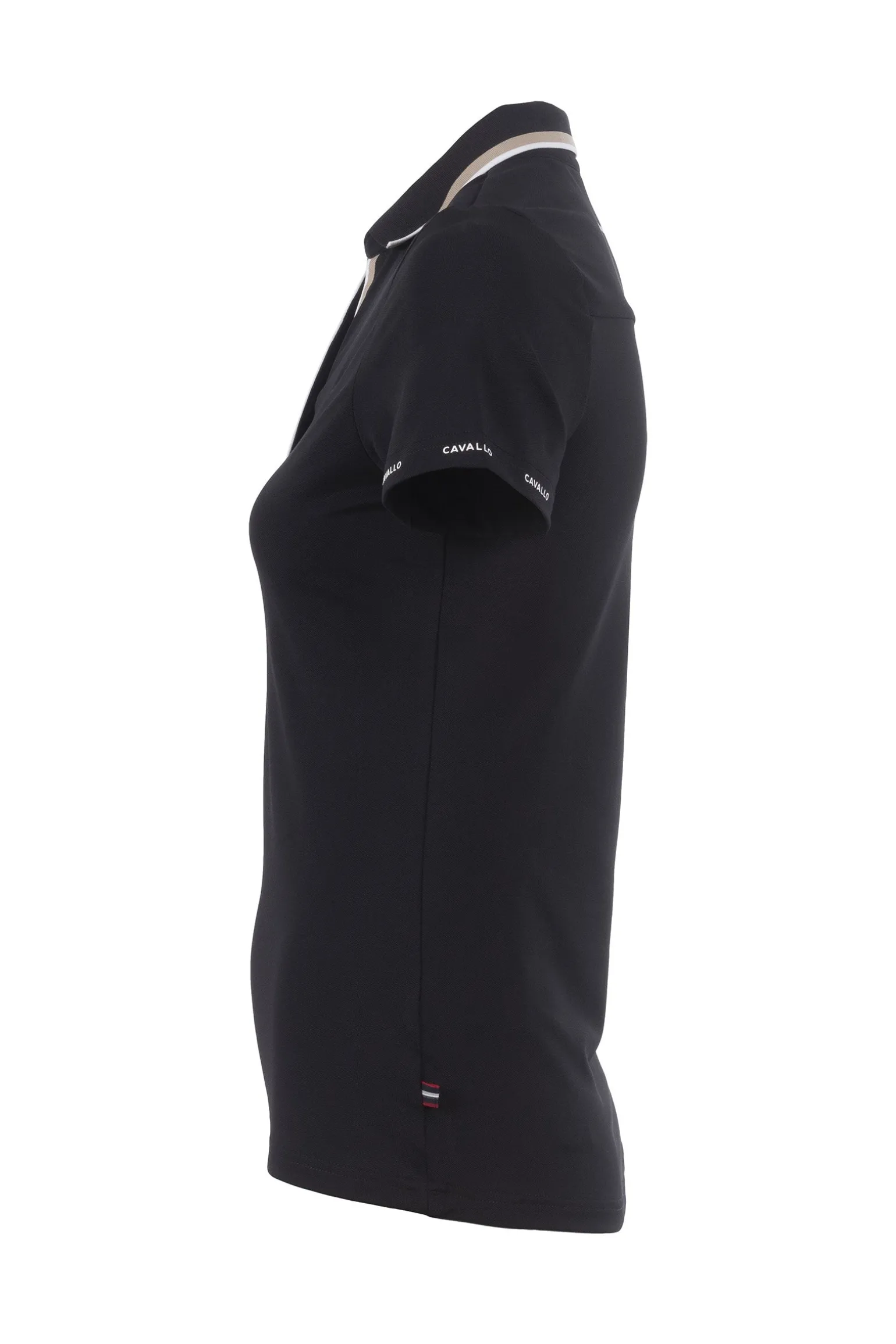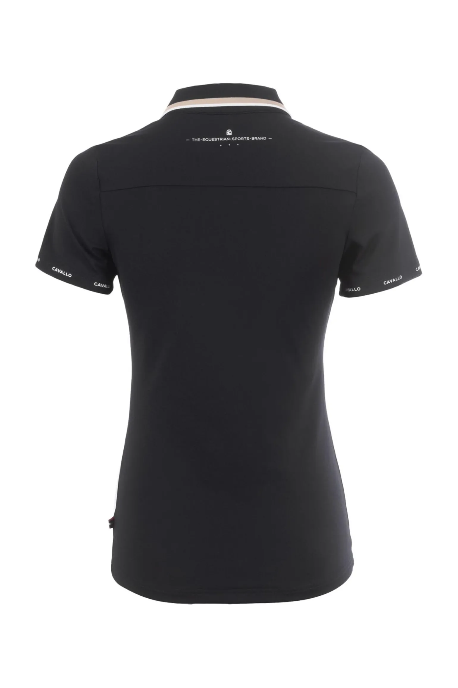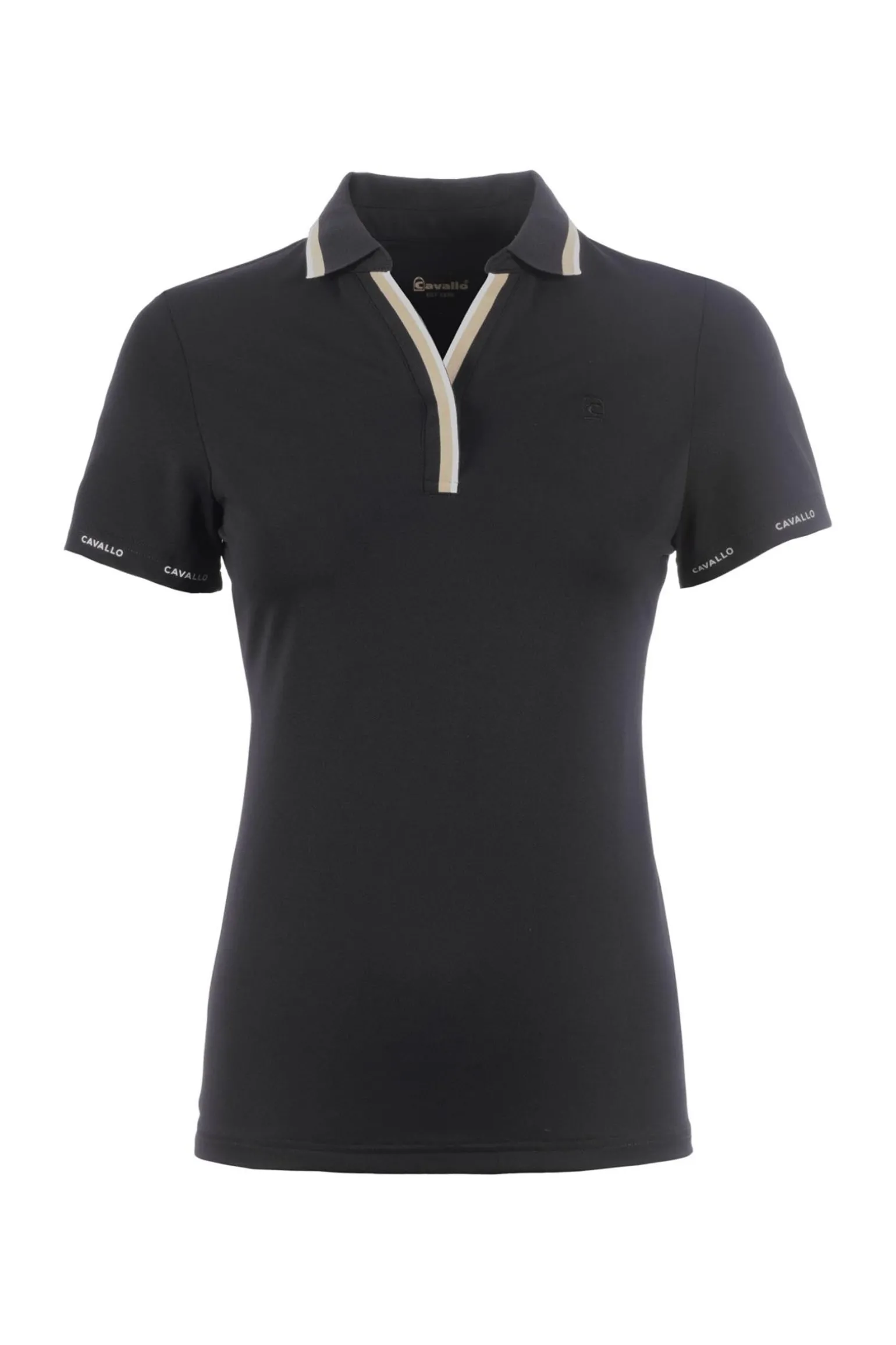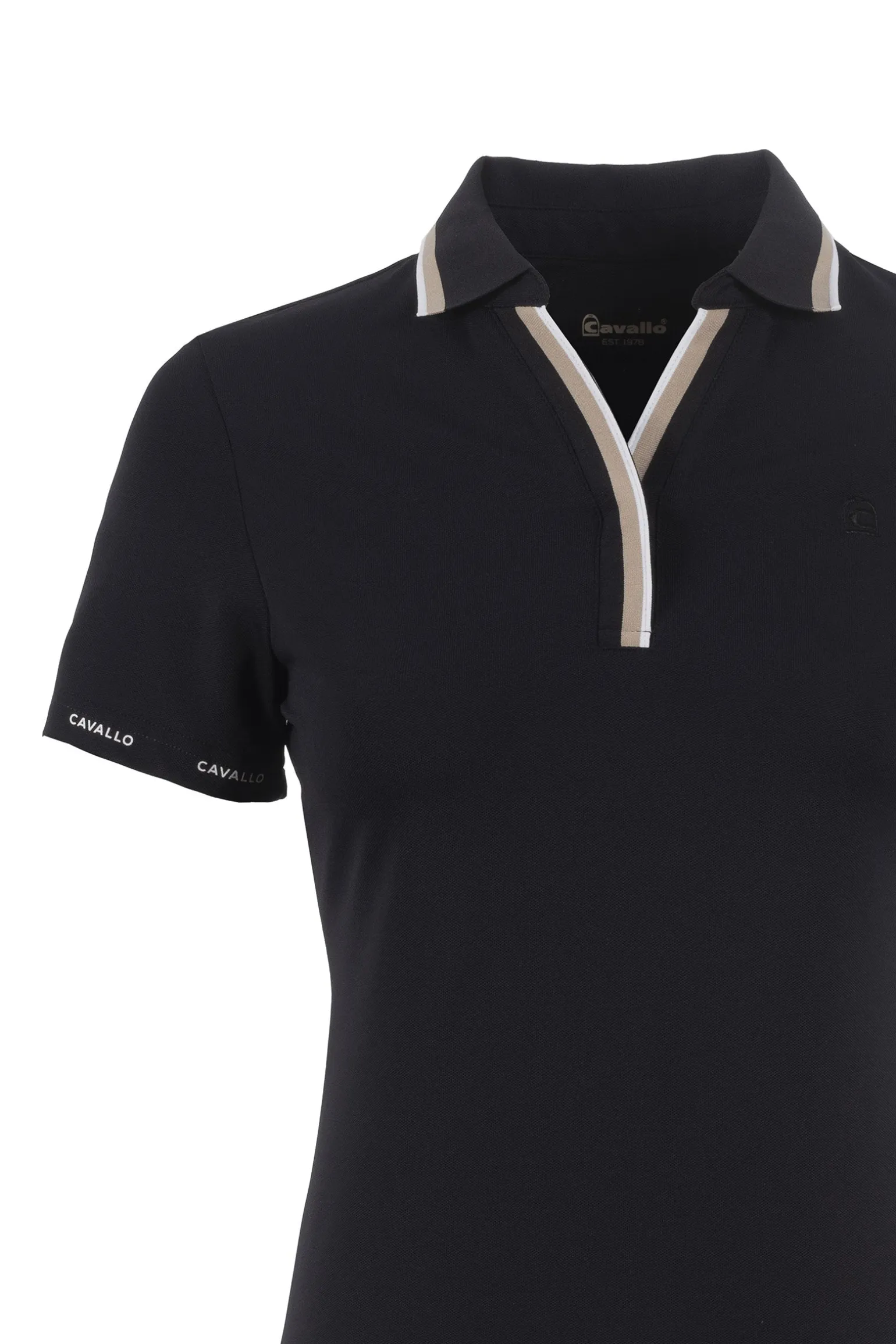 Sportliches Poloshirt mit V-Ausschnitt aus funktionellem Piqué. Gerippter Kragen mit Kontraststreifen am Rand sowie gerippter V-Ausschnitt mit verdeckter Knopfleiste und zwei weiteren Kontraststreifen. Ton-in-Ton gesticktes Cavallo-Sattelmotiv auf der linken Brust. Cavallo-Schriftzug in Weiß rund um die Ärmelsäume. Weißer Cavallo-Druck mit Kristallen mittig im Nackenbereich.