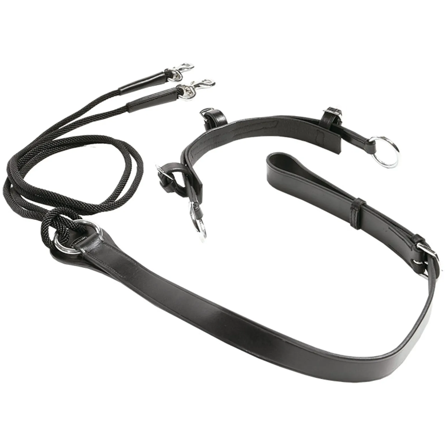 Made of quality leather. Consisting of head piece, leather loop for girth, round stitched nylonthread with hooks.