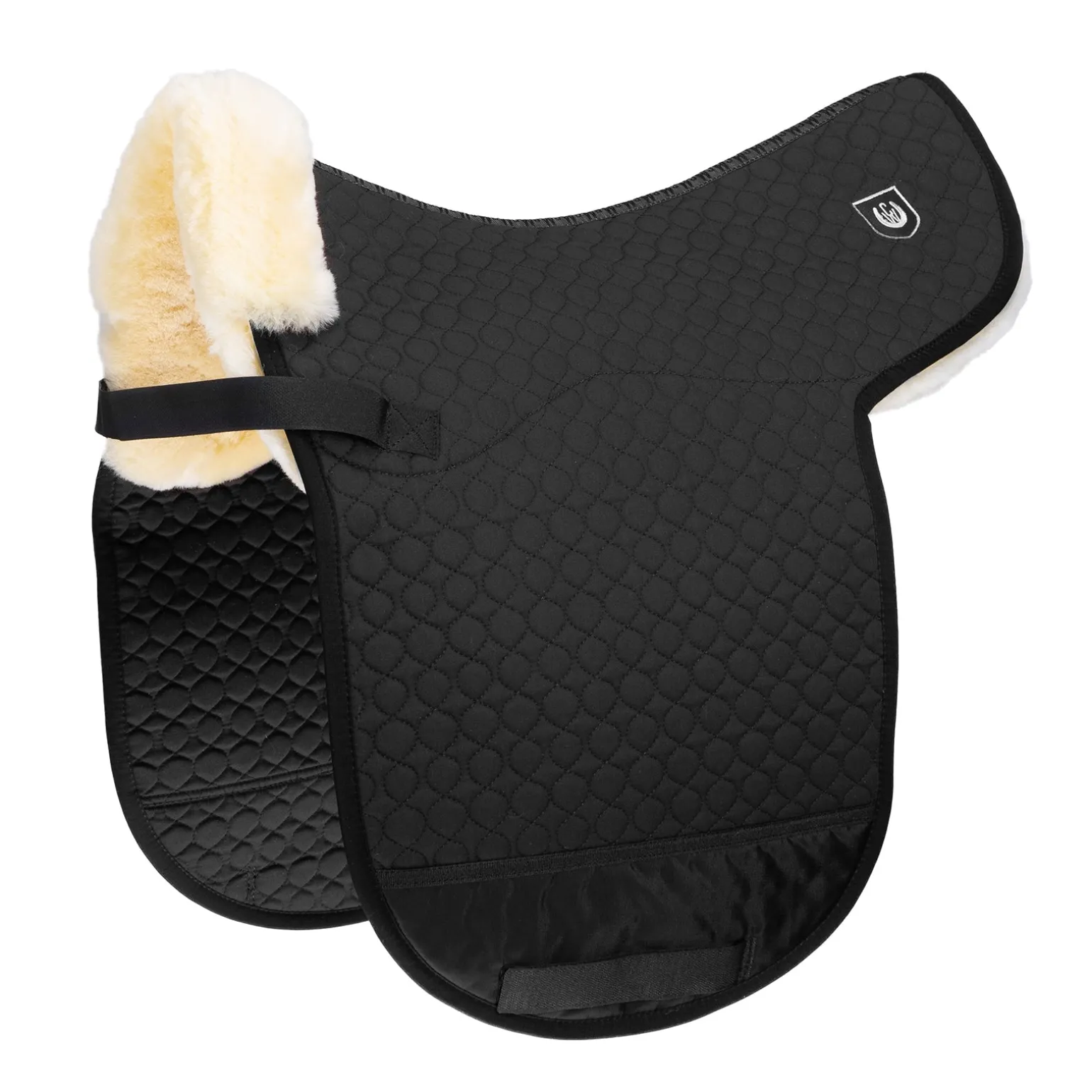 Die Satteldecke ist nur im Sitzbereich mit Lammfell ausgestattet. Der Blattbereich bleibt frei. Die Befestigung erfolgt mit Klettstrupfen an den Gurtriemen des Sattels und mittels einer Gurtführung am Blattende. Der eingearbeitete Nylonschutz verhindert das Aufscheuern im Bereich der Sattelgurtung. Vorne wird das Lammfell bis auf die Oberseite herumgezogen und dient als Sattelanlage.