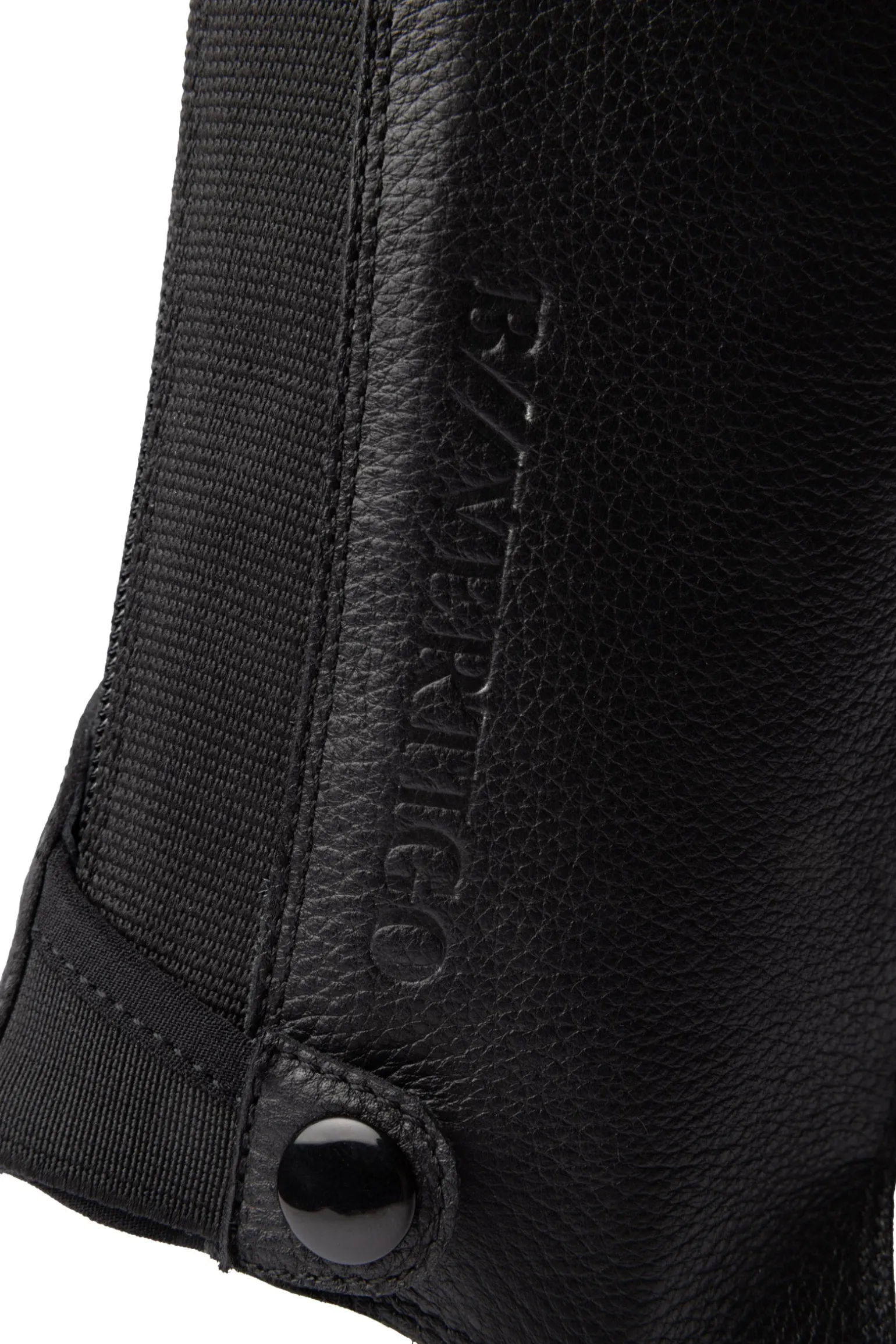 Premium leather chaps with elastic inserts for flexibility.