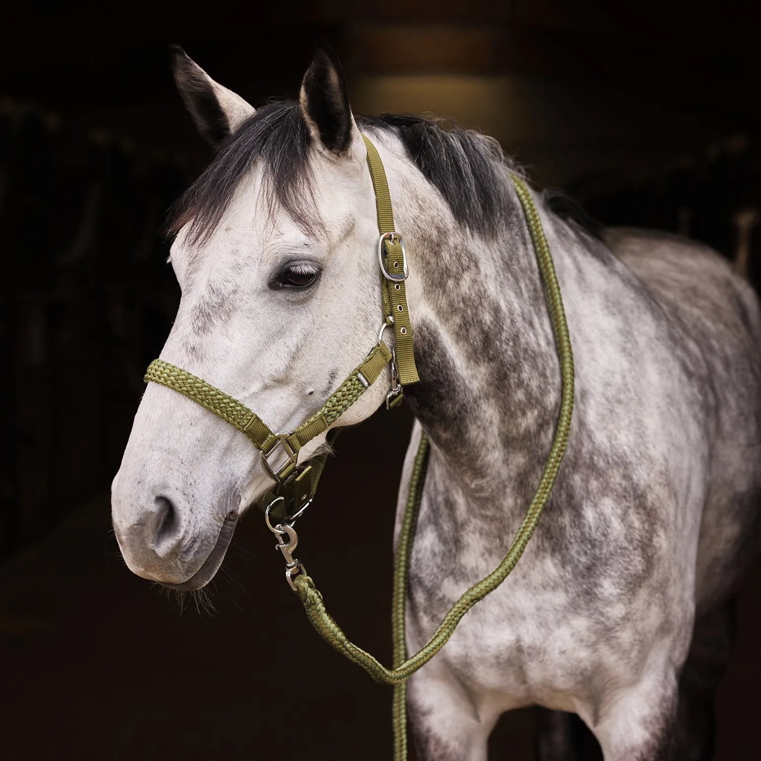 Geflochtene Backen- und Nasenriemen sorgen bei diesem Halfter und Führstrick Set für einen schönen Touch. Das geflochtene Muster wiederholt sich im Führstrick. Verstellbarer Genick- und Nasenriemen bieten eine perfekte Passform.