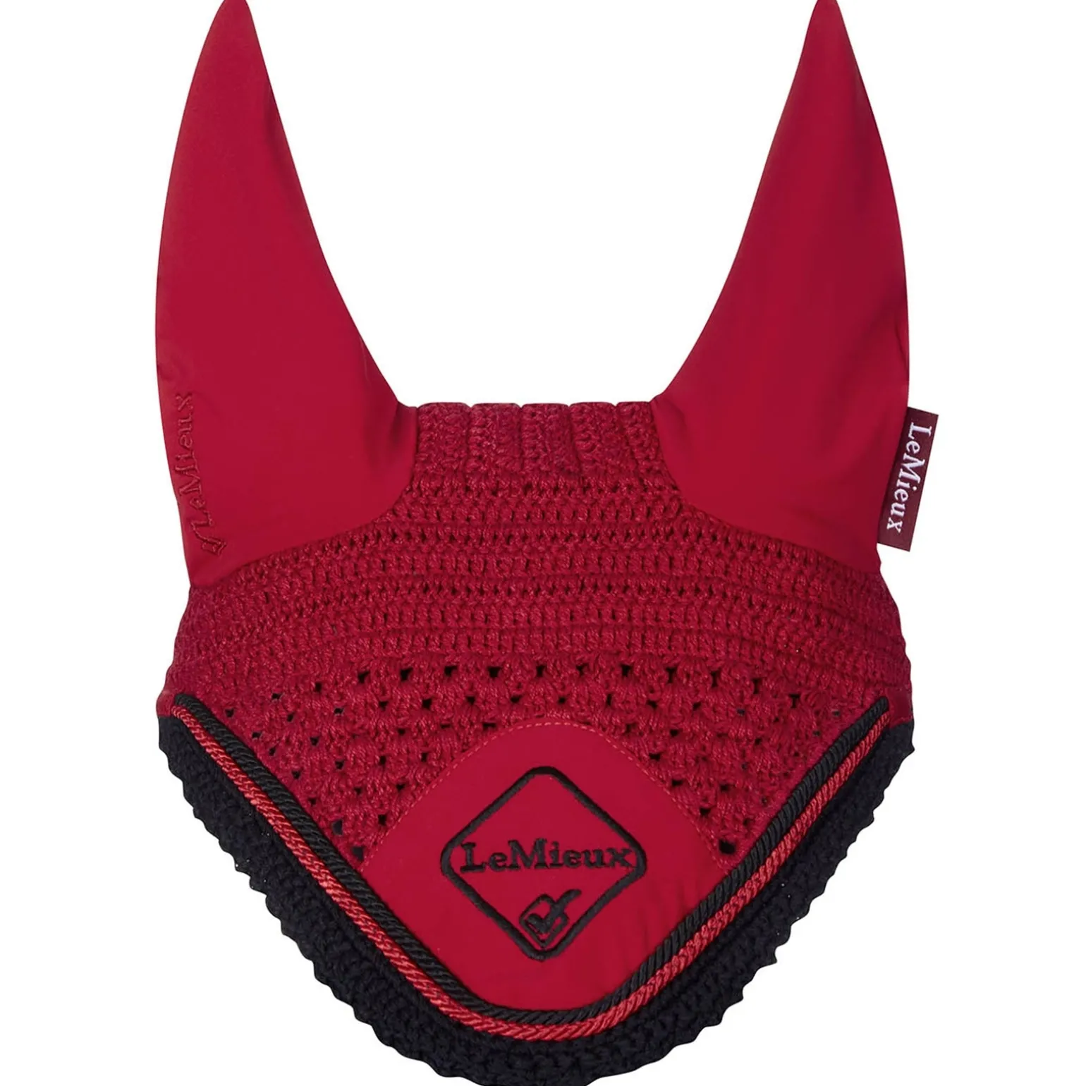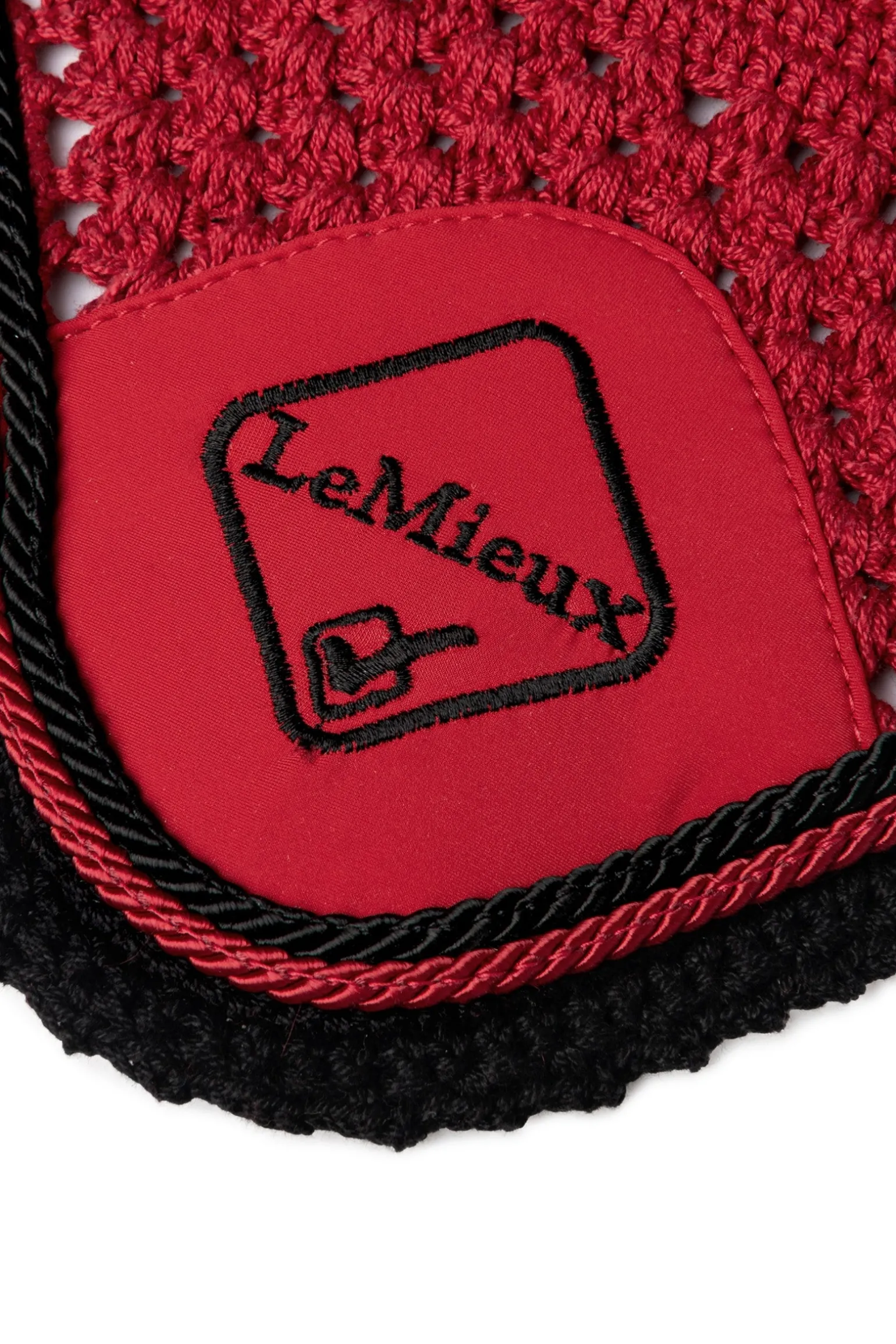 Aus hochwertiger 3-Wege-Häkelarbeit mit Flechtakzenten und ergänzt um weiches, bequemes Lycra im Ohrenbereich liegt diese Fliegenhaube sicher und eng unter der Trense an.