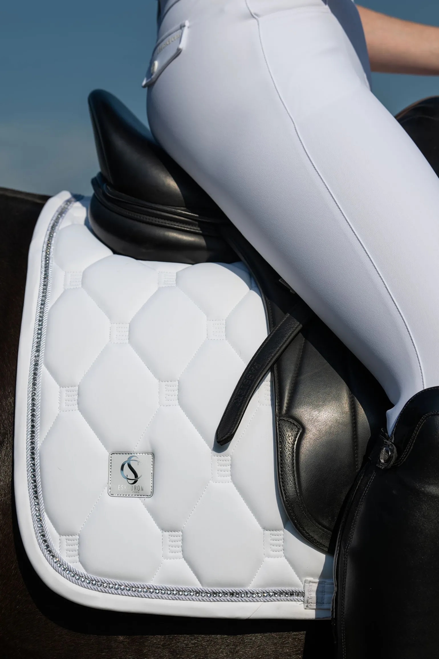 Die Eskadron Classic Sports SS25 Softshell Crystal Dressurschabracke vereint Innovation und Eleganz. Die robuste Softshell-Oberfläche mit kühl-trockener Innenseite sorgt für optimalen Komfort und Feuchtigkeitsregulierung. Die elegante E-Steppung verleiht eine edle Optik, während rutschfeste Silikonflächen im Sattelbereich für zusätzliche Stabilität sorgen. Die stilvolle Kombination aus Kordel und Kristallkordel auf der Softshell-Einfassung setzt luxuriöse Akzente. Das Classic Sports Emblem und das Flaggenlabel auf beiden Seiten vervollständigen das Design. Für maximale Luftzirkulation sorgt der Mesh-Rückenkanal. Das Innostrap-System gewährleistet eine sichere Frontfixierung, während der Gurtstrap mit dreifacher Befestigungsmöglichkeit eine präzise Positionierung erlaubt. Eine perfekte Kombination aus Stil und Funktionalität für Dressurreiter.