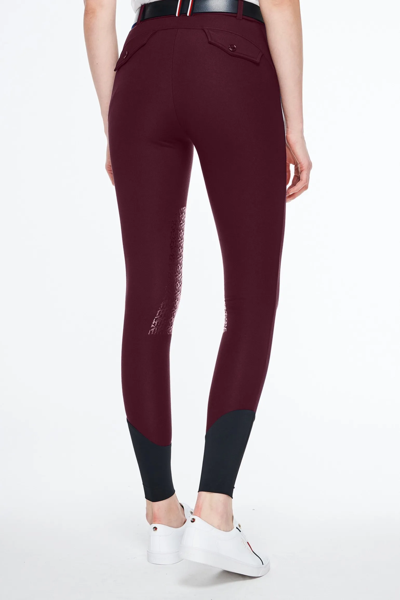 All-Season Kneegrip Reithose von Tommy Hilfiger mit zwei Jeans Taschen vorne und zwei Attrappen-Klappentaschen mit Knopf hinten. Die Reithose besitzt einen Beinabschluss aus elastischem Jersey für einen bequemen Einstieg und einen Bund Verschluss vorne mit Haken und zusätzlichem Safety-Button. Es gibt eine Logo Stickerei vorne seitlich unterhalb des Bundes, sowie eine TH Global Stripe Applikation auf einer Gurtschlaufe vorne und auf den zwei Mittleren hinten.