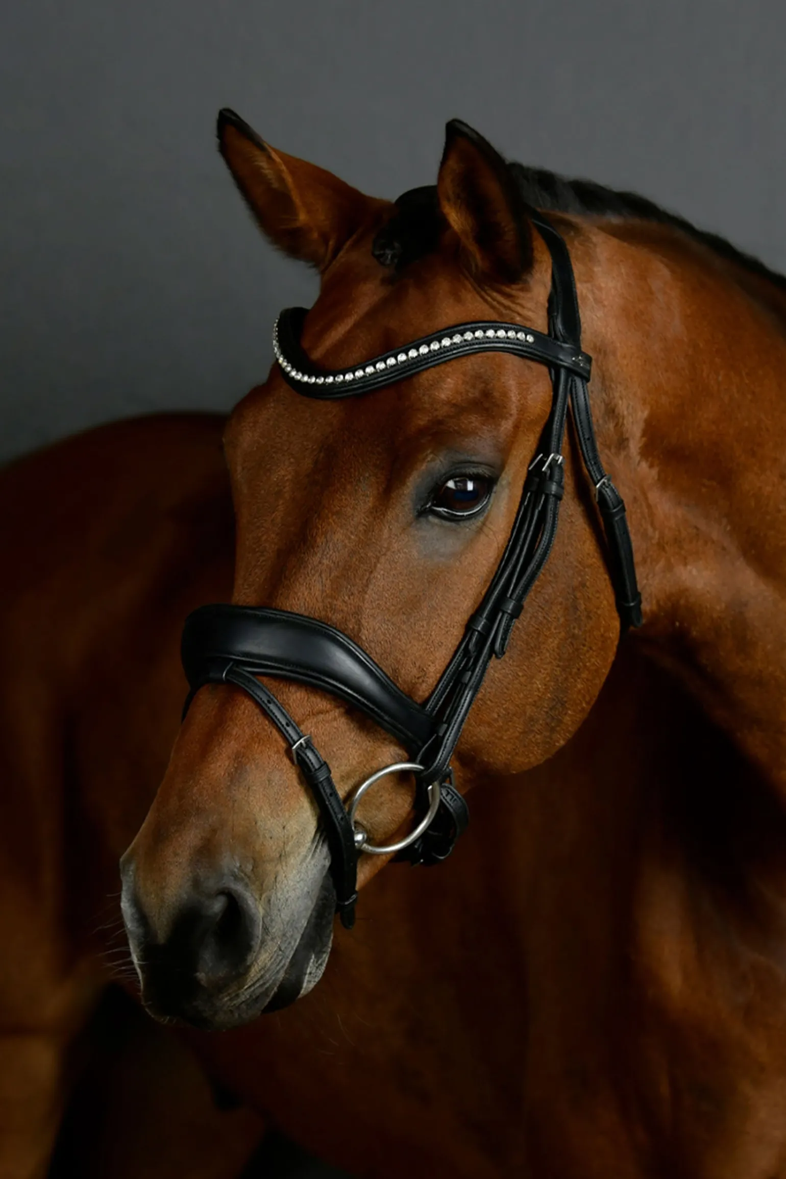 Diese Dressurtrense wird aus feinstem europäisch und indisch gegerbtem Leder gefertigt und fühlt sich besonders weich und geschmeidig an – für optimalen Komfort deines Pferdes. Du hast die Wahl zwischen zwei Stirnriemen: einem schlichten, geschwungenen Lederstirnriemen für das tägliche Training und einem atemberaubenden Modell mit Kristalldetails für den großen Auftritt im Viereck. Das anatomisch geformte Kopfstück ist weich gepolstert und im Genick breiter geschnitten, um den Druck gleichmäßig und angenehm zu verteilen. Der abnehmbare Blitzriemen lässt sich in ein einfaches Kappzaum-Nasenband umwandeln. Robuste Beschläge aus rostfreiem Stahl, ein gepolstertes Kurbelriemenband und verstellbare Schnallen an Nasen- und Kehlriemen auf beiden Seiten sorgen für die perfekte Passform. Die passenden Zügel sind separat erhältlich.