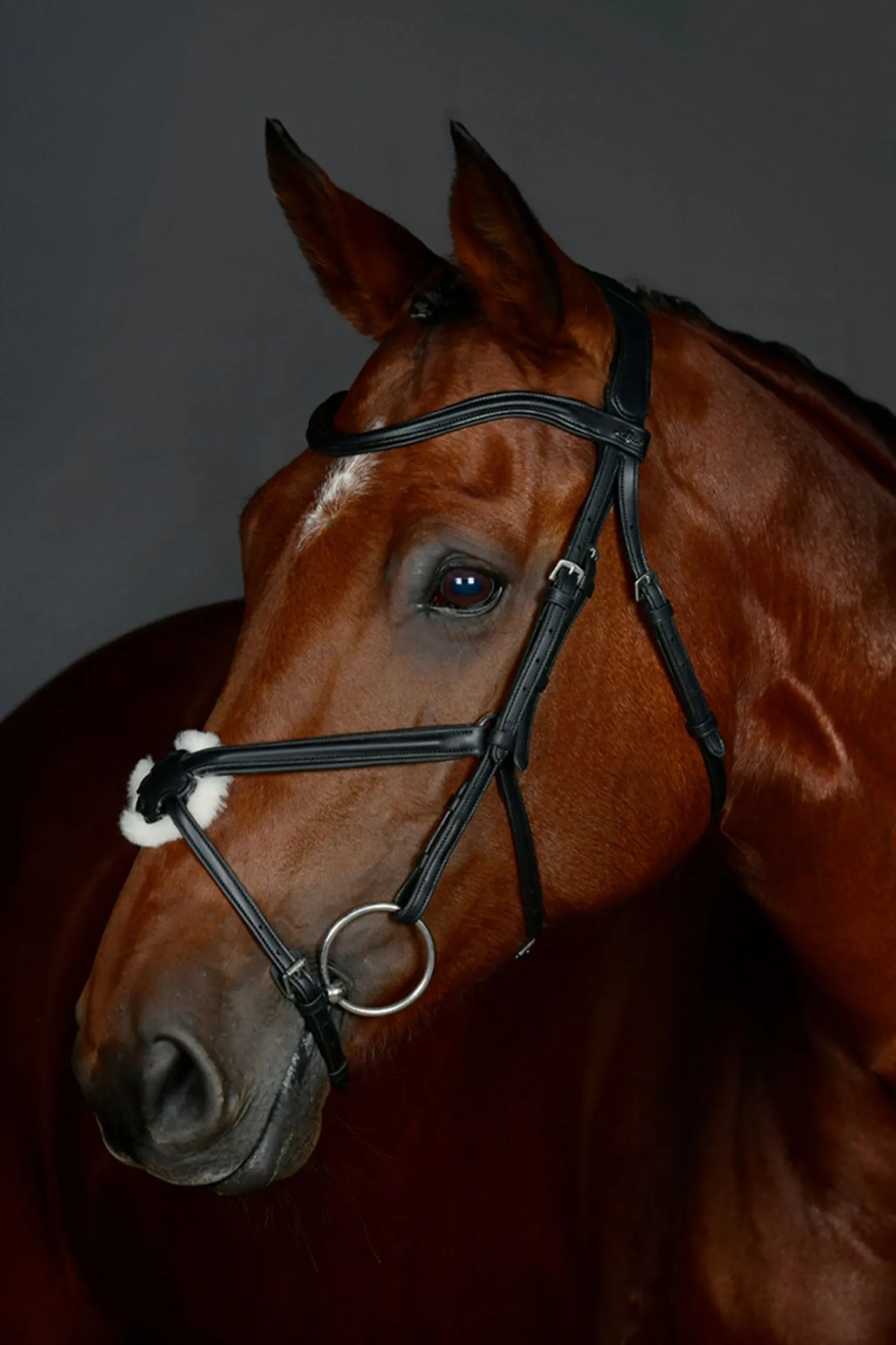 Diese Trense wird aus feinstem europäisch und indisch gegerbtem Leder gefertigt und fühlt sich besonders weich und geschmeidig an – für optimalen Komfort deines Pferdes. Das erhabene Lederdesign mit stilvollen tonalen Nähten verleiht ihr einen edlen Look. Das anatomisch geformte Kopfstück ist durchgehend weich gepolstert und im Genick breiter geschnitten, damit der Druck gleichmäßig und angenehm verteilt wird. Für zusätzlichen Komfort sorgt die abnehmbare Schafslederscheibe, die sich leicht reinigen lässt – alternativ kannst du auch eine Glattlederscheibe einsetzen. Robuste Beschläge aus rostfreiem Stahl und verstellbare Schnallen an Nasen- und Kehlriemen auf beiden Seiten ermöglichen eine präzise Passform. Perfekt für den Alltag oder den Turnierstart. Die passenden Zügel sind separat erhältlich.