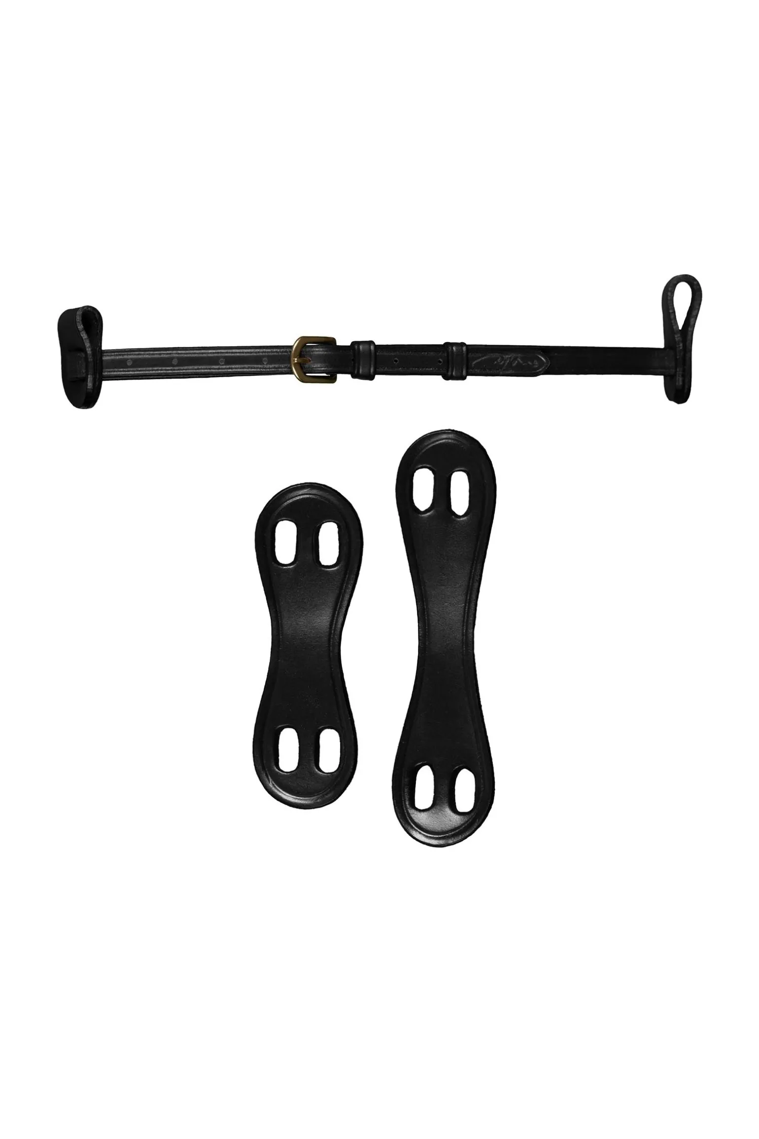 Lederner Sperriemen, der bei Bedarf mithilfe der Befestigungsschlaufen an einem Reithalfter befestigt werden kann.