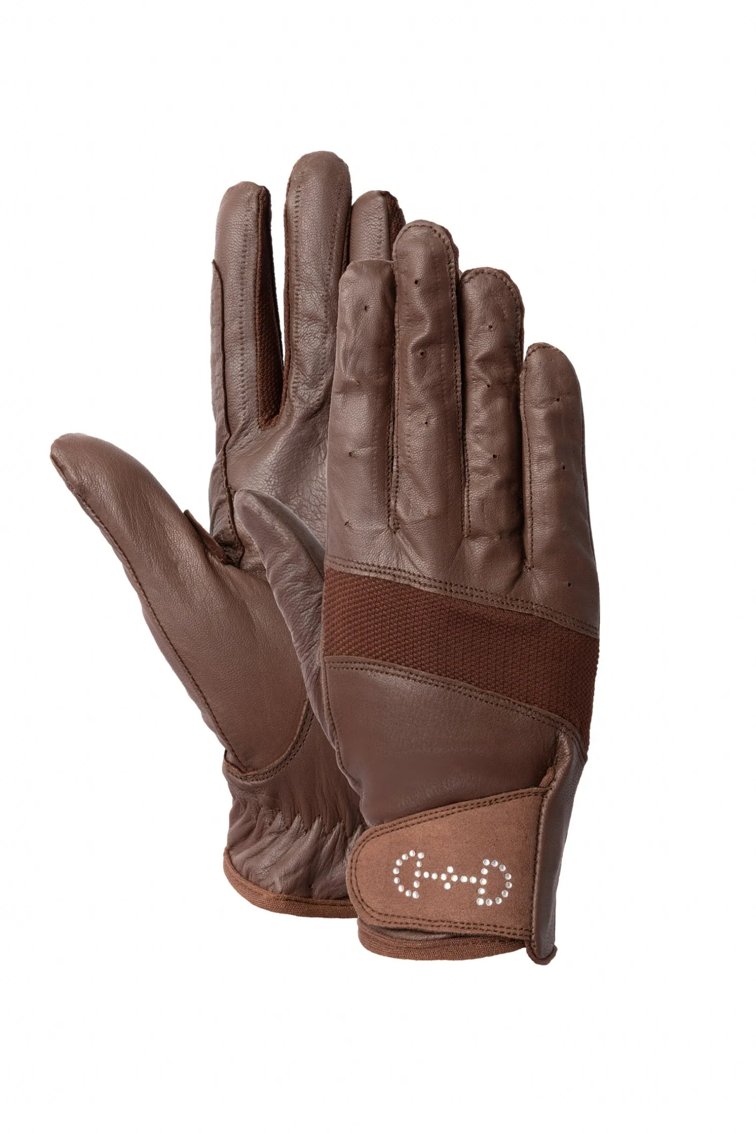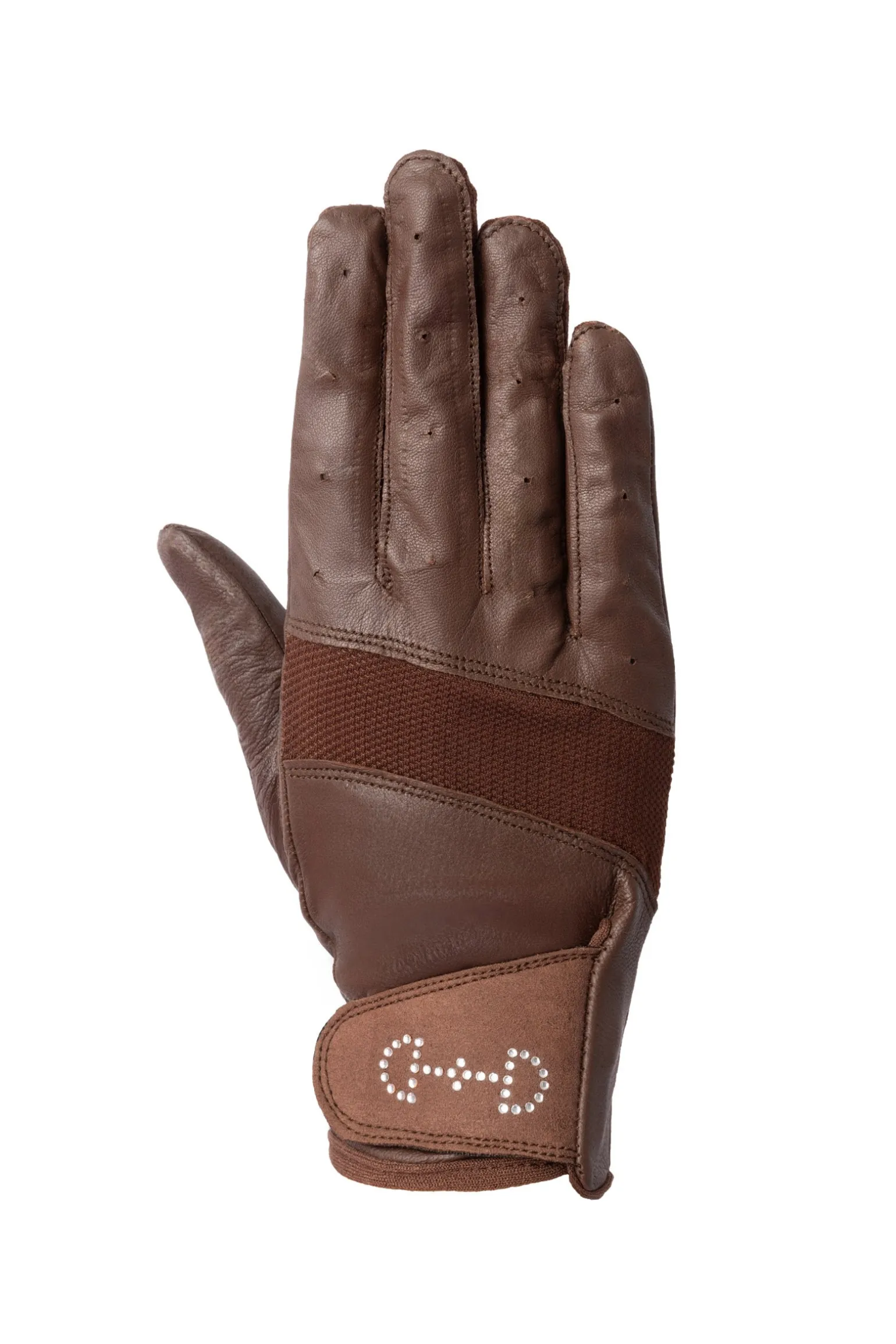 Eine winzige D-Ring-Trense mit Kristallen wird an der hinteren Manschette dieser schönen Mesh-Handschuhe für eine feminine Note hinzugefügt. Das Leder verfügt über eine Netzrückseite zur Belüftung an heißen Sommertagen. Diese Handschuhe passen sich Ihren Händen an und bieten guten Halt beim Reiten.