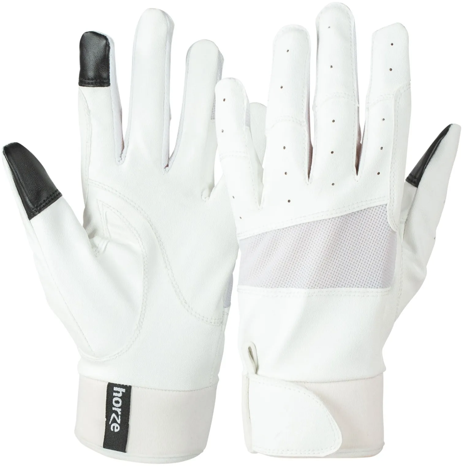 Diese Reithandschuhe aus weichem Kunstleder mit Netzeinsätzen bieten die ideale Belüftung. Die Bündchen aus weichem Neopren sind bequem und elastisch, und der verstellbare Riemen sorgt für die perfekte Passform. Synthetisches Leder auf der Handfläche sorgt für guten Halt, und das kleine Metall-Logo ist ein dezentes Detail.