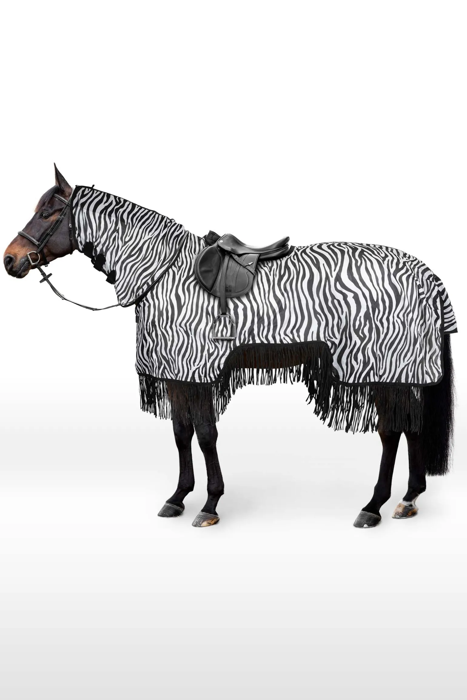 Wir alle lieben das Reiten im Sommer, aber lästige Fliegen und stechende Insekten mindern den Spaß für Reiter und Pferd. Die Horze Defender Reitdecke ist UV-schützend und verfügt über ein großartiges Zebramuster, das Schutz vor lästigen und stechenden Insekten von Kopf bis Schweif bietet. Zebrastreifen sind eine hochwirksame Abschreckung gegen Insekten, da die kontrastierenden Streifen nachweislich Fliegen verwirren und abschrecken und so helfen, Insektenstiche und Irritationen zu reduzieren.Fransen entlang des Saums bilden eine bewegliche Barriere, die Fliegen noch weiter abhält, während das glatte Futter entlang des extra langen Halses dieser Reitdecke hilft, Reibung zu vermeiden.Das vollständig atmungsaktive Material sorgt dafür, dass das Pferd nicht überhitzt, während der Sattelausschnitt und die Klettverschluss-Zaumzeugschlaufen Sicherheit und eine hervorragende Passform bieten.
