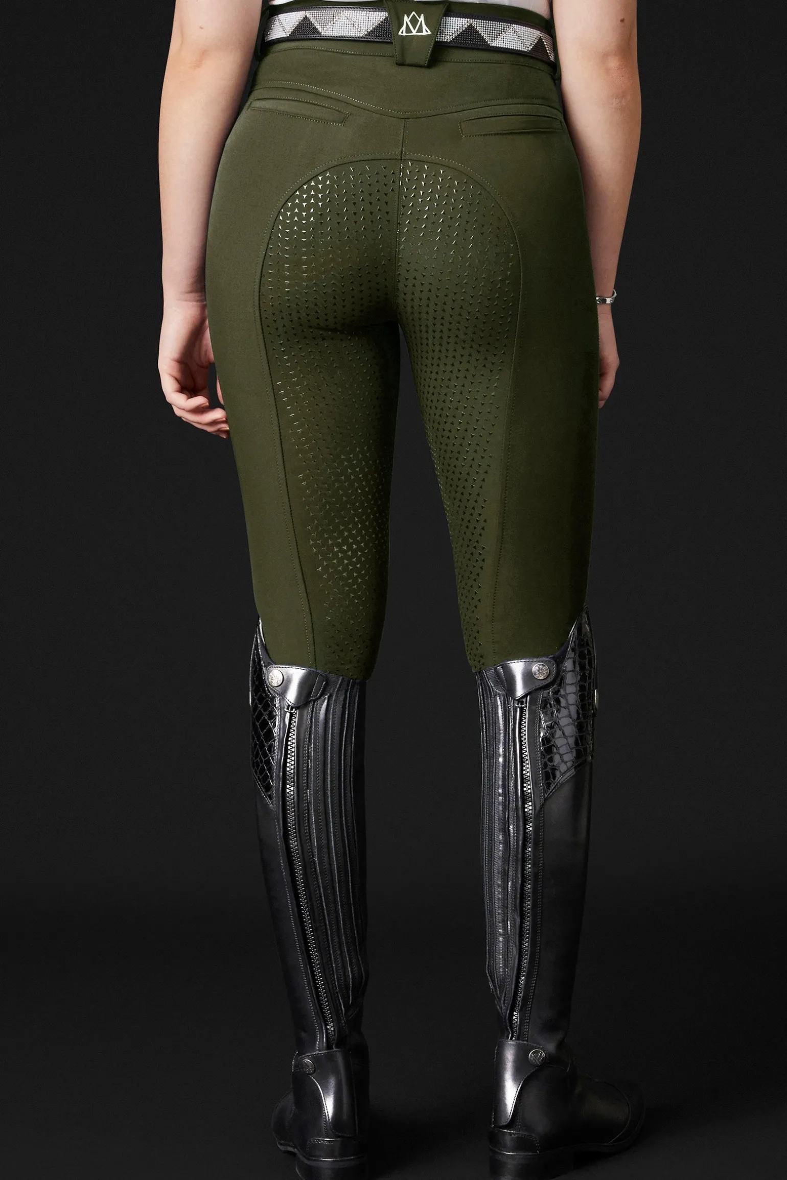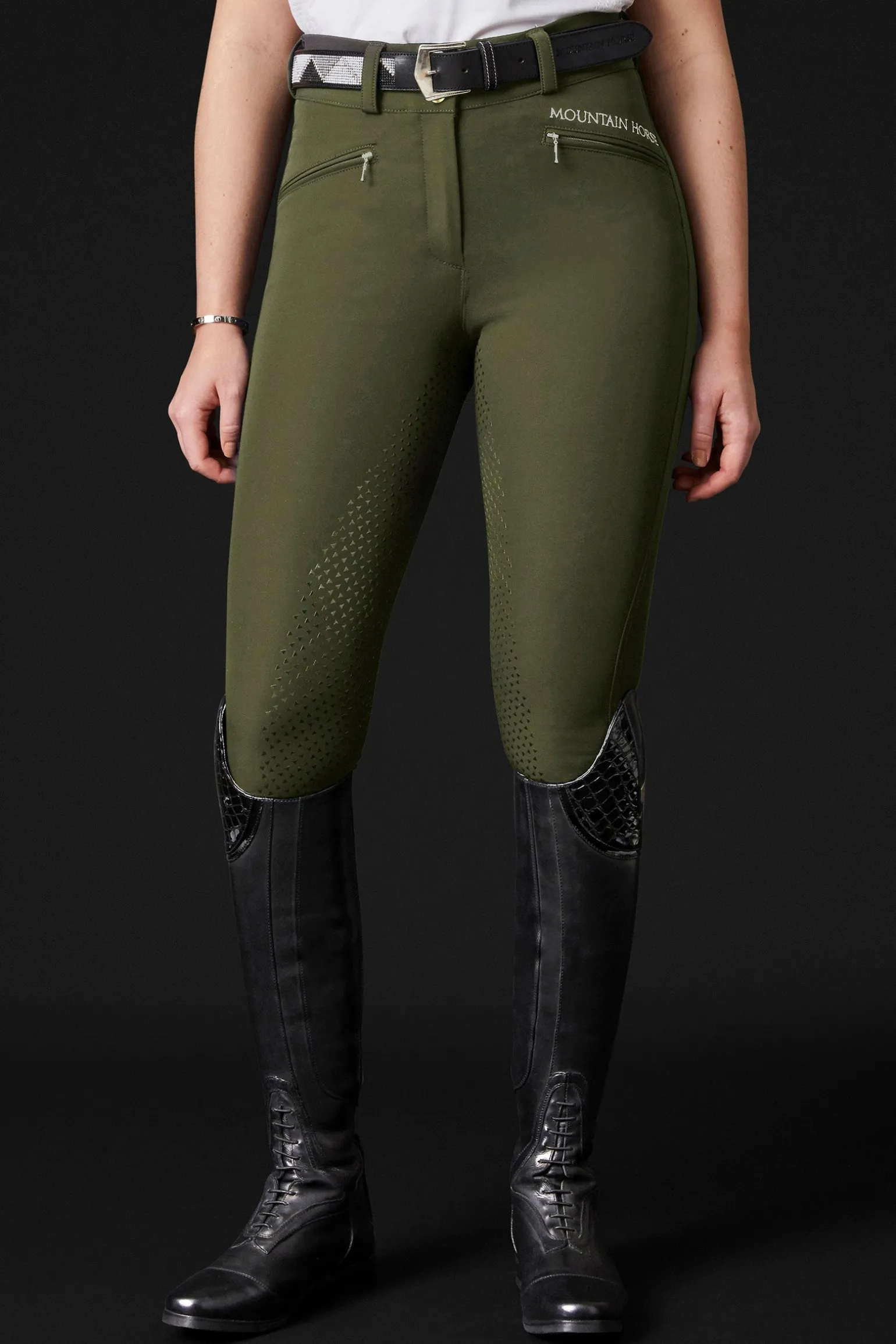 Diese Reithose mit hoher Taille und durchgehendem Silikongrip ist aus hochwertigem, atmungsaktivem Gewebe gefertigt, das Feuchtigkeit transportiert und abweisend gegen Schmutz und Flüssigkeiten wirkt. Der flexible Beinabschluss sorgt für zusätzlichen Komfort. Die vorderen Taschen haben Reißverschlüsse und der hohe Bund hat einen doppelten Verschluss.