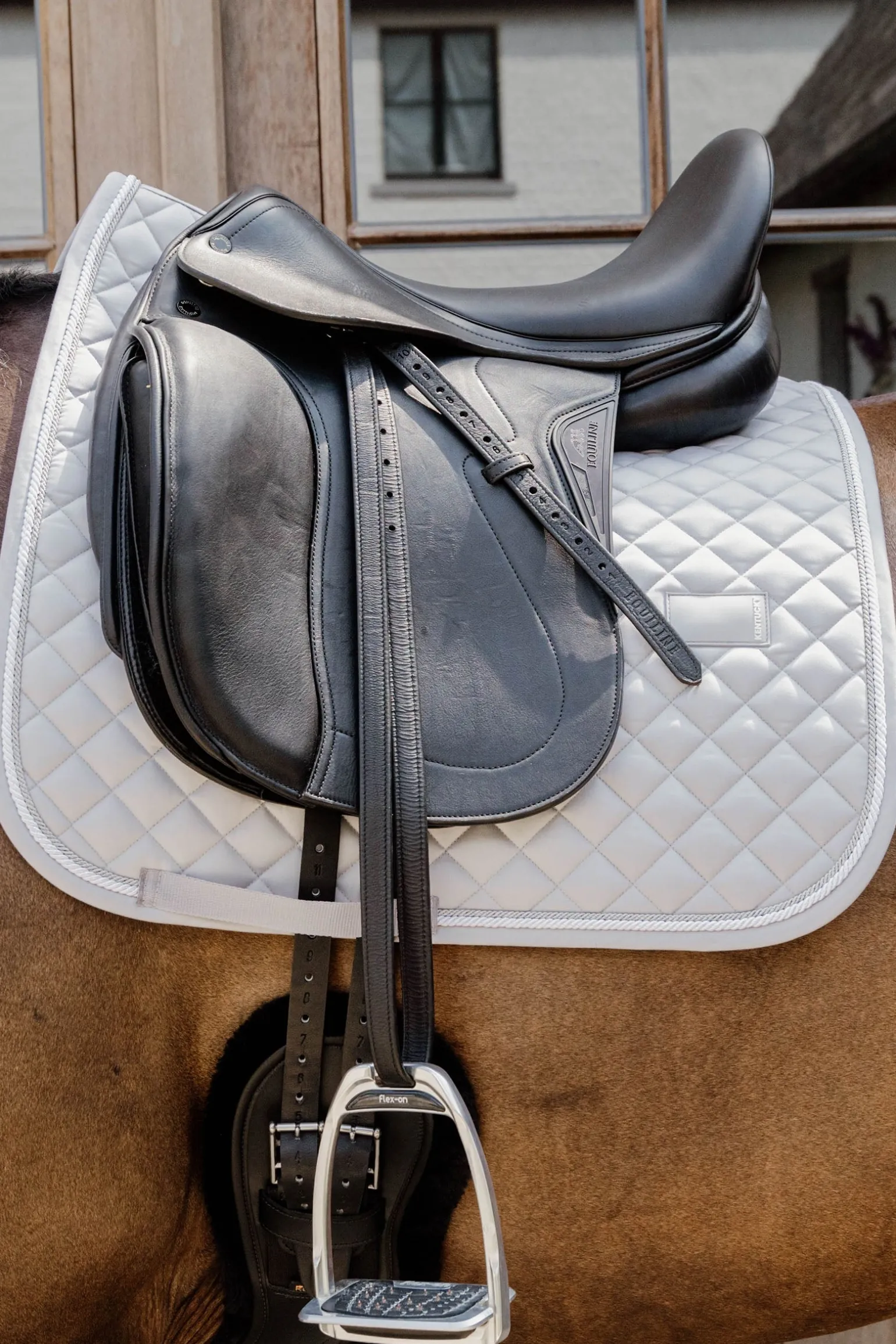 Sorge mit dieser Schabracke Diamant für einen eleganten Look und bewundernde Blicke. Diese Schabracke kombiniert elegantes Design mit höchstem Tragekomfort, den du sehen und spüren kannst. Die im klassischen Stil gehaltene Schabracke Diamant mit auffälliger Bordüre verleiht deinem Pferd einen Hauch von Exklusivität. Das edle Design sorgt für bewundernde Blicke – ob im Training oder auf dem Turnier. Die Schabracke besteht aus einem feuchtigkeitsabsorbierenden und schnelltrocknenden Baumwoll-Polyester-Gemisch. Mit ihr fühlt sich dein Pferd auch bei intensiven Trainingseinheiten wohl und kommt nicht unnötig ins Schwitzen. Innenliegend verfügt die Schabracke über eine atmungsaktive Polsterung, die einen effektiven Dämpfungseffekt zwischen Sattel und Rücken bietet. Das aufgenähte Kentucky-Logo, aus hochwertigem Gummi, verkörpert die Kentucky-Qualität bereits von Weitem. Dank der anatomischen Form passt sich die Schabracke perfekt an den Rücken deines Pferdes an und entlastet den Widerrist optimal. Kein Verrutschen, kein Drücken, kein Reiben – einfach ein sicherer Sitz, damit du selbstbewusst und kontrolliert reiten kannst, ohne dass dein Pferd beeinträchtigt wird.