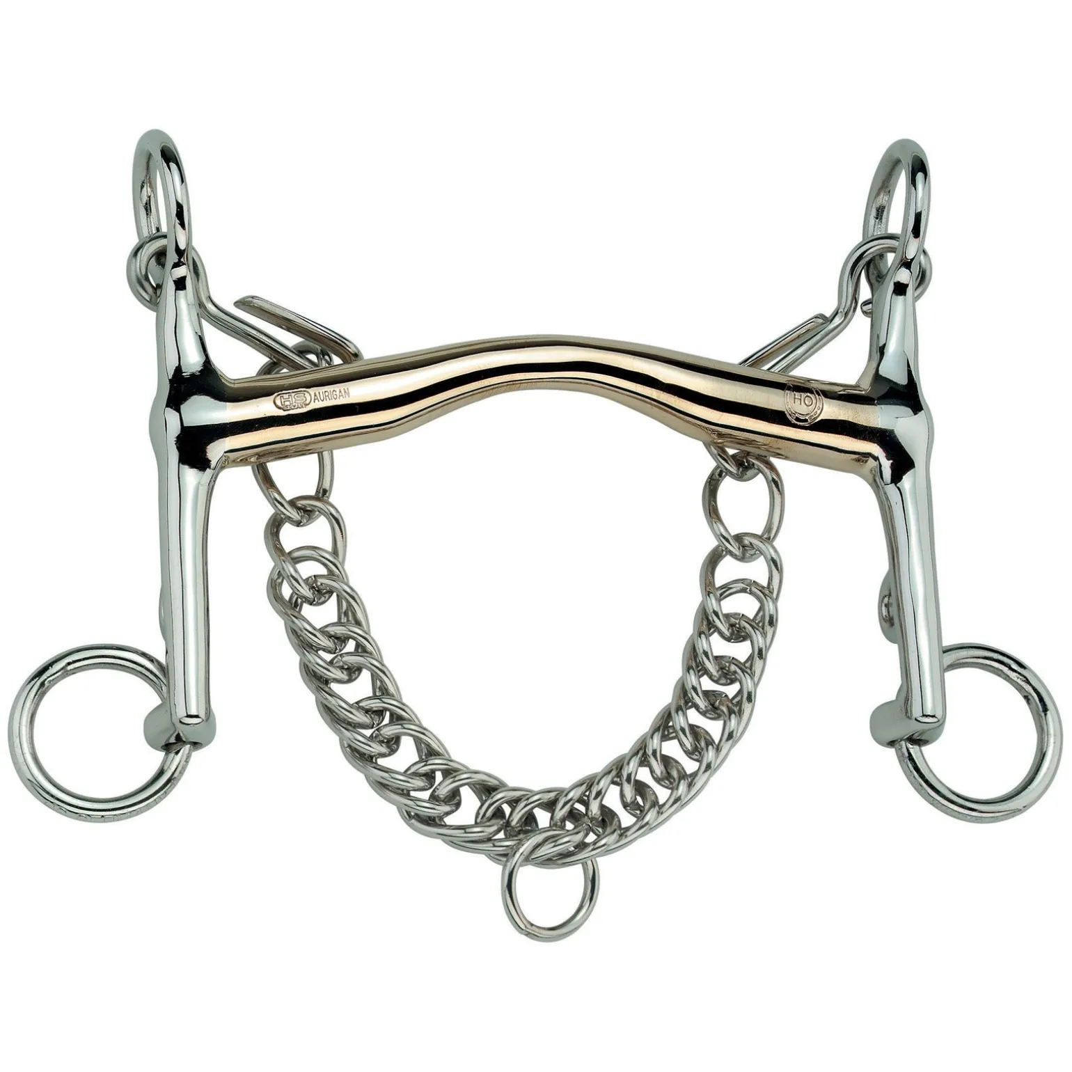 Dieses einzigartige Kandarengebiss mit dem schrägen Mundstück und der geschmeidigen, abgerundeten Zungenfreiheit, ist nach vorne gebogen und wirkt mit sanftem Druck auf die Zunge ein. Das Gebiss hat den Vorteil, die Zügelhilfen extrem präzise auf die empfindliche Zunge zu übertragen. Sehr geeignet für Pferd, die sensibel auf Kandaren reagieren. Das gebogene Mundstück unterstützt die Harmonie zwischen der Hand des Reiters und dem Maul des Pferdes, sodass ein entspannter und stetiger Kontakt zu der Kandare besteht. Weniger Zügeleinwirkung wird durch die kurzen Anzüge benötigt. Vorsichtige Reiterhände sind hierfür sehr wichtig.