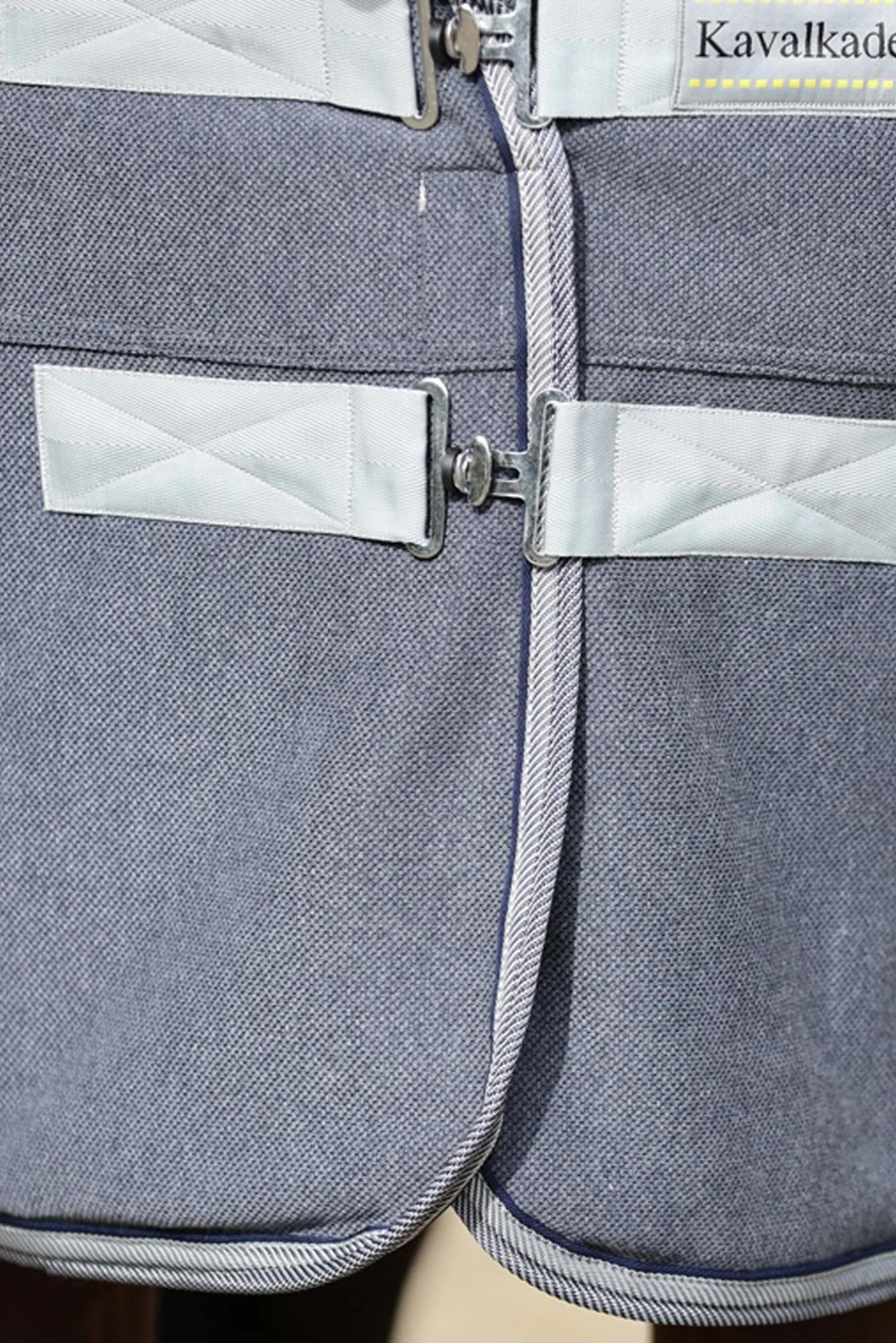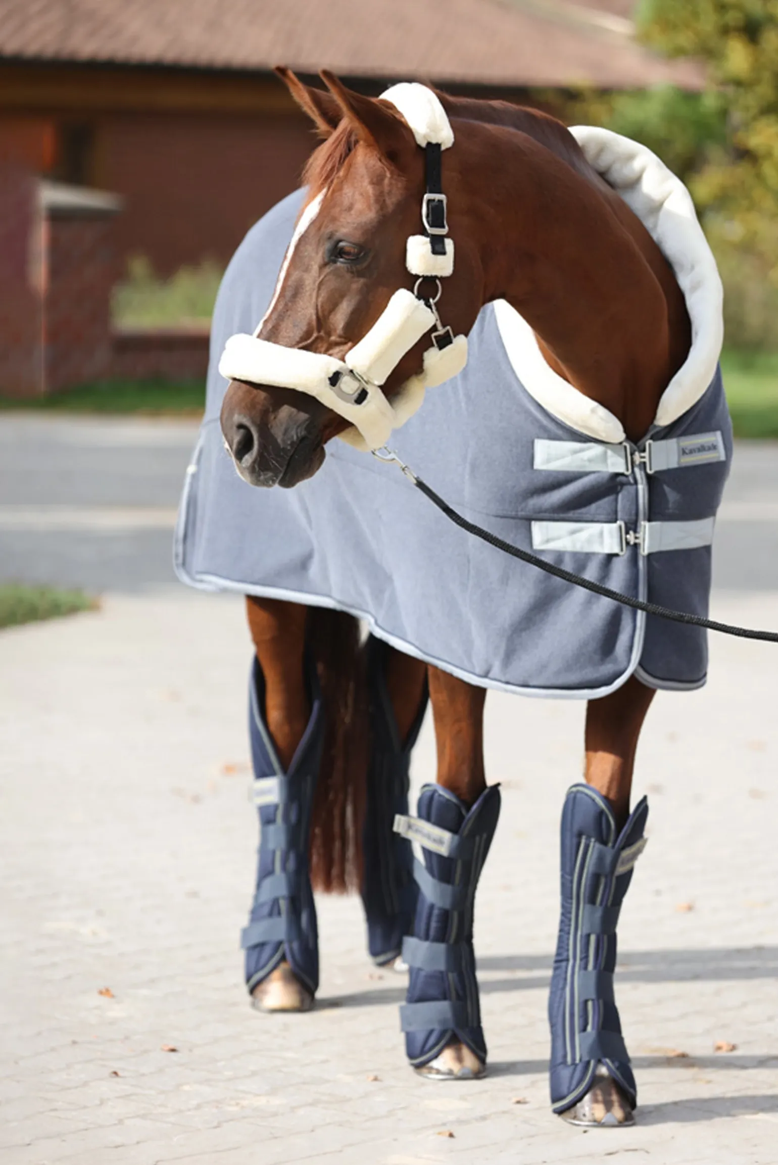 Schicke Decke mit einem modischen Fellkragen, die sowohl als Transportdecke als auch als Abschwitzdecke verwendet werden kann. Auf der Innenseite aufgeraut, hat die Decke eine schwere Fleecequalität mit sehr gutem Feuchtigkeitstransport. Die inneren Kreuzgurte sind abnehmbar. Mit modischer blauer Paspel, tiefem Schweifriemen und doppeltem Drehhakenverschluss.