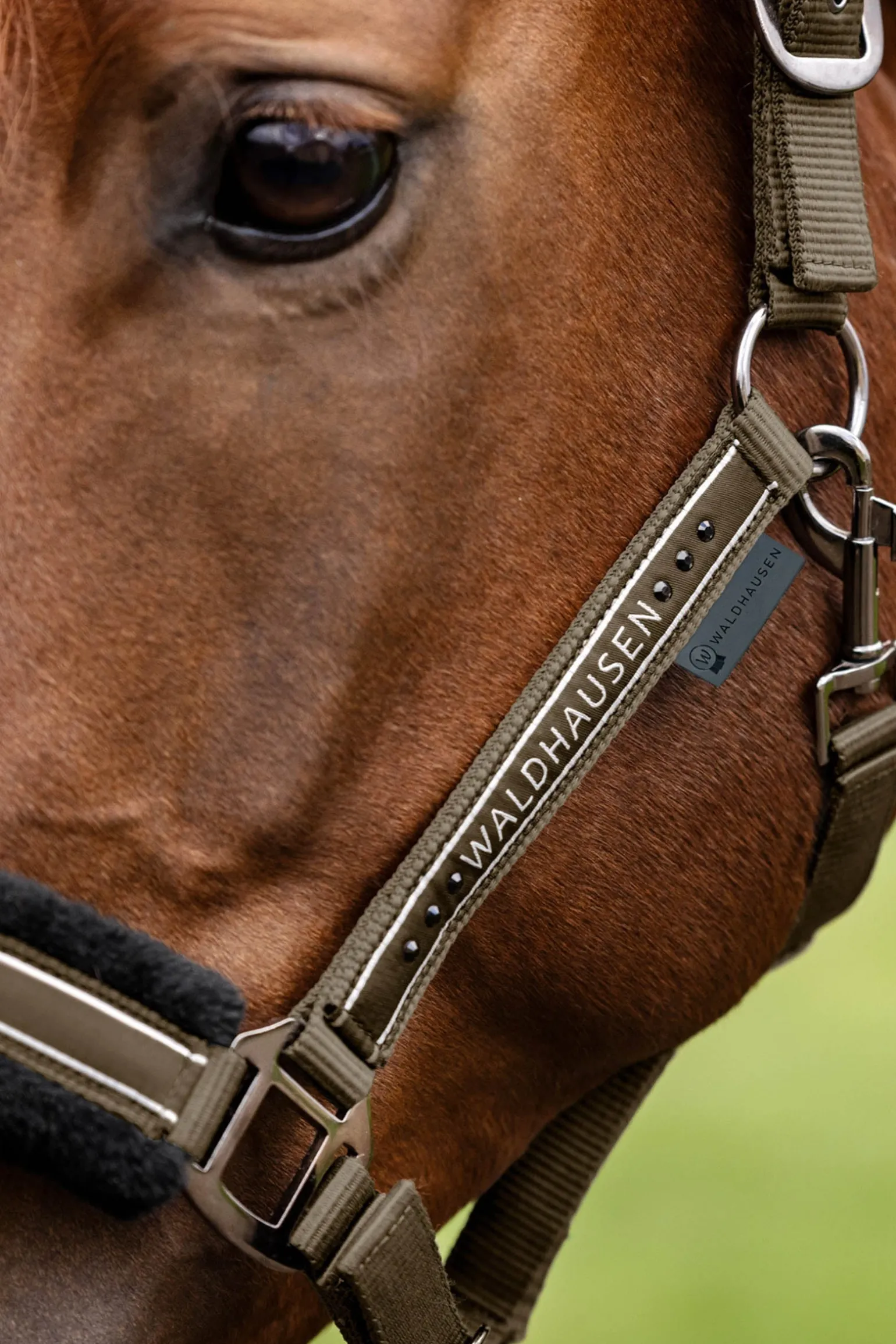 Flauschiges Halfter mit Waldhausen-Modeband und matten Beschlägen Highlight: zusätzliche Strasssteine am Nasenriemen Weiche Polsterung aus Kunstfell am Genickstück und Nasenriemen Mehrfach verstellbar am Kinnriemen und Genickstück