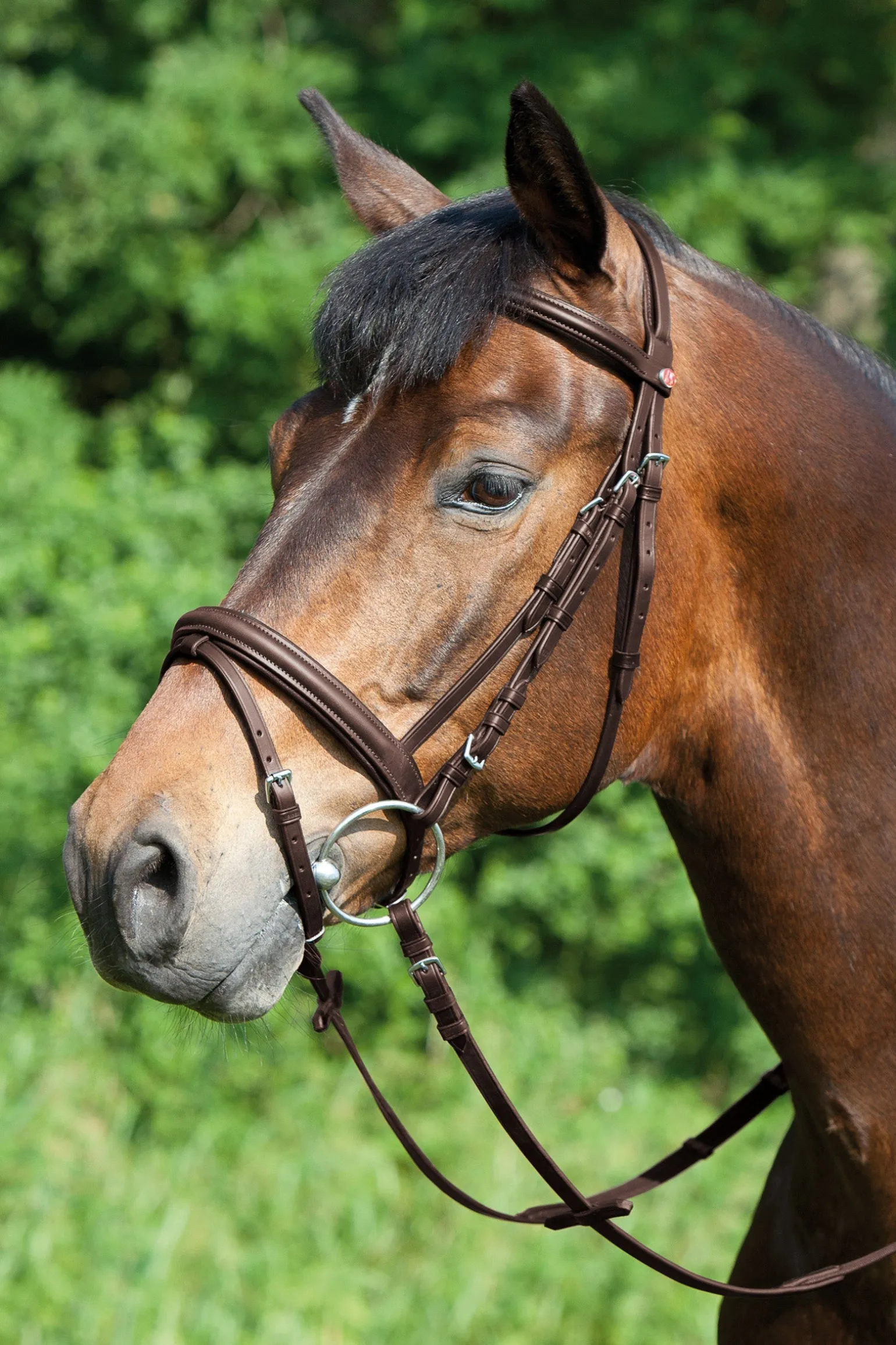 Das Modell Ergonomic Line ist ein schlicht designter, en-gblisch kombinierter Trensenzaum aus bestem Qualitätsleder. Genickstück und Nasenband sind weich gepolstert und schmiegen sich durch das weiche Leder an den Pferdekopf an.