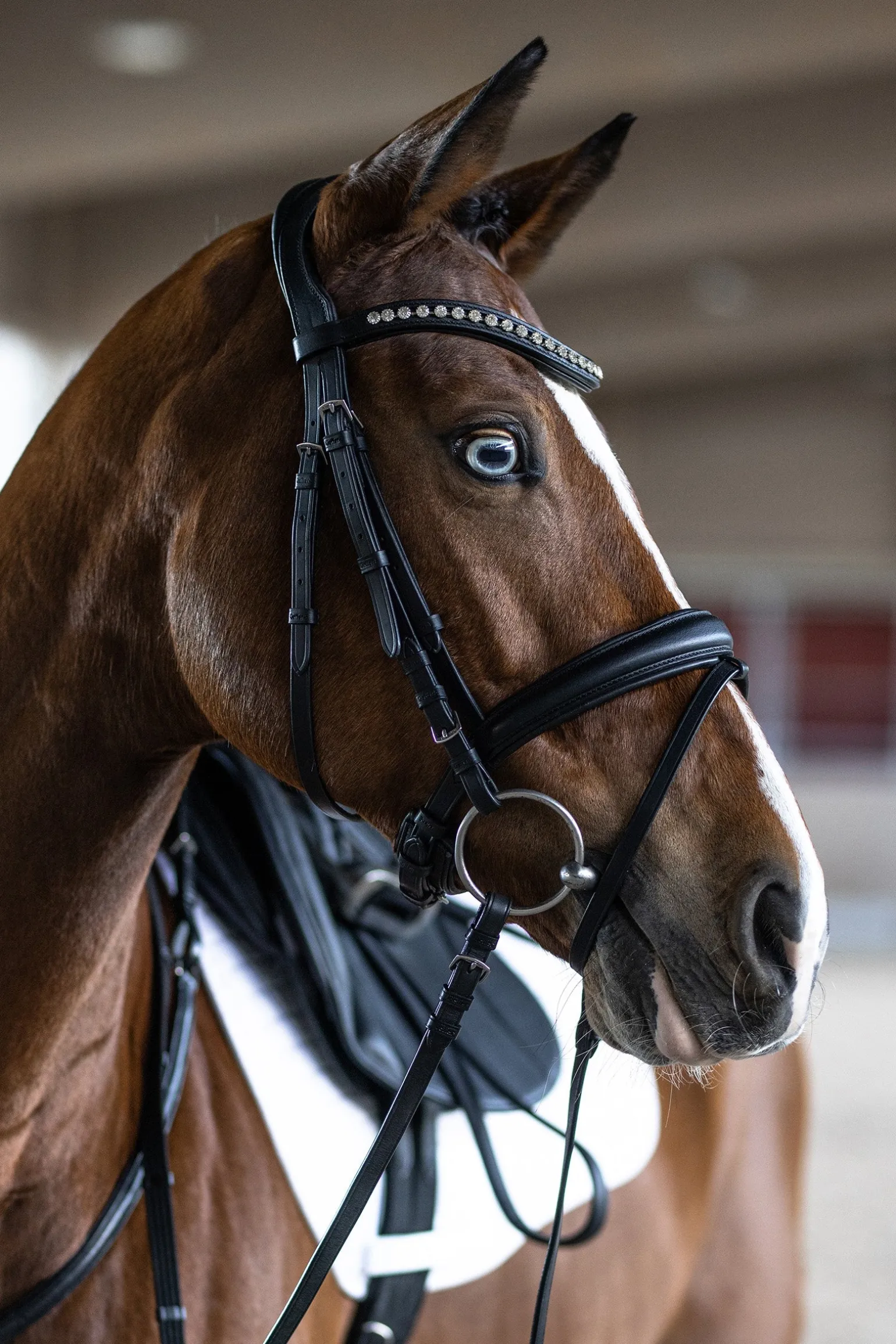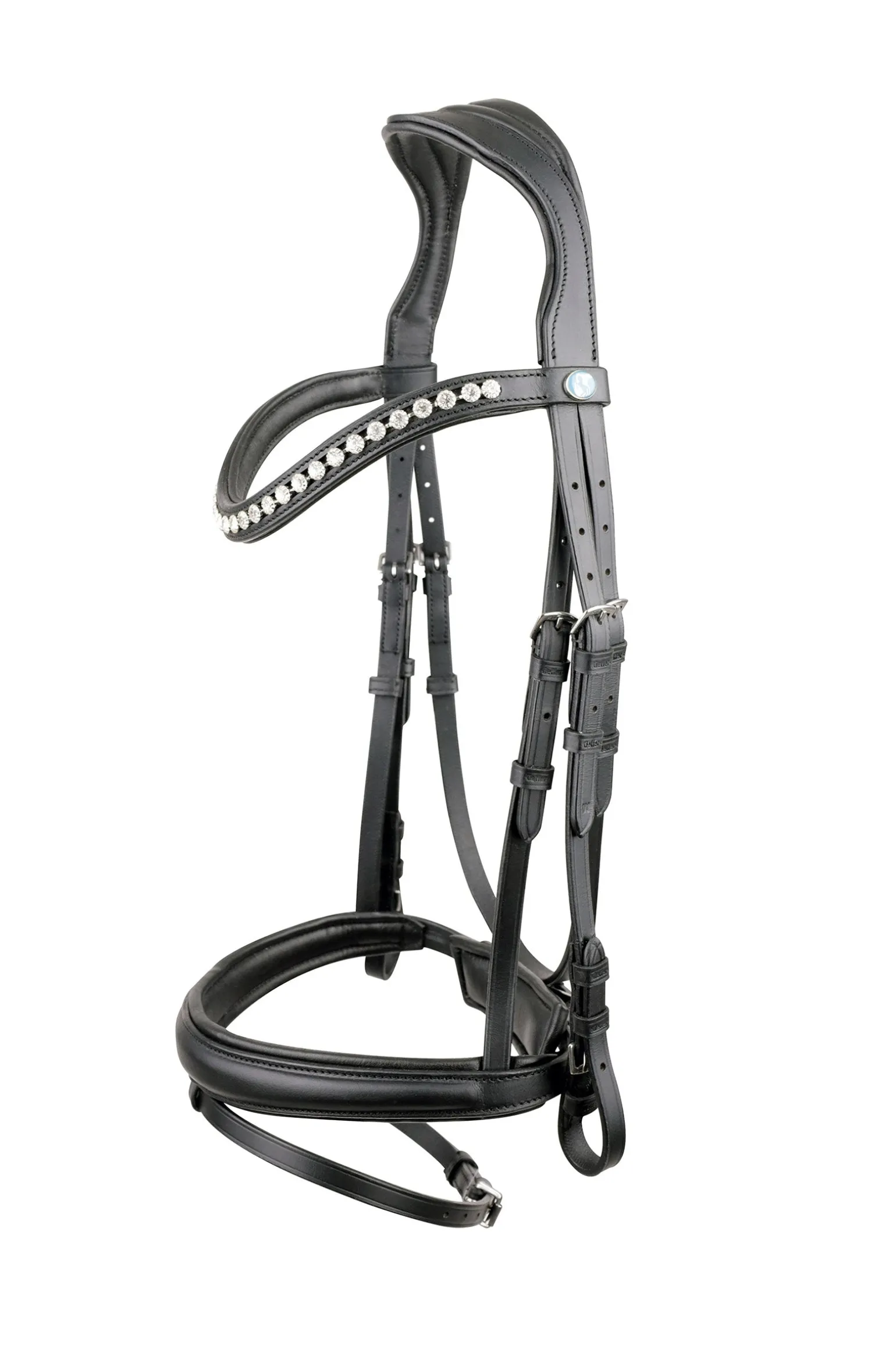 Englisch kombinierter Trensenzaum mit anatomisch geformtem Kopfstück und geschwungenem Kristallstirnband.