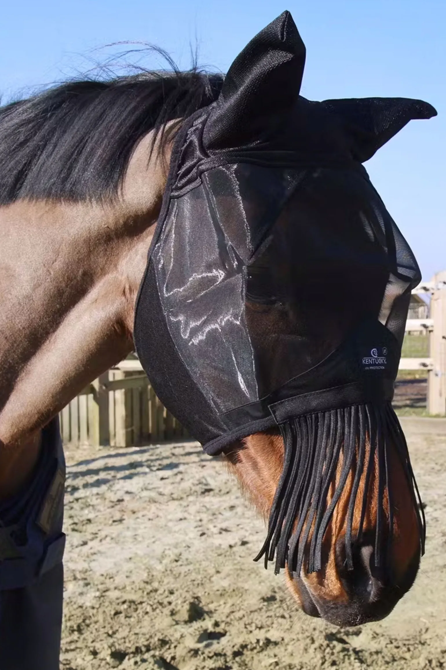 Die Fliegemaske Classic mit Ohren schützt die Augen und Ohren deines Pferdes vor Fliegen und anderen Insekten. Die Fransen schützen die Nase deines Pferdes, ohne sie vollständig zu bedecken. Sie bietet maximalen Schutz vor Insekten, ohne das Pferd zu stören. Diese Fliegemaske ist ideal für Pferde, die sehr empfindlich auf Insekten reagieren. Sie kann auf der Weide getragen werden und ist besonders widerstandsfähig gegen verspielte Pferde. Die Fliegemaske wird mit einem doppelten Klettverschluss unter dem Kiefer des Pferdes geschlossen. Die Classic Fliegemasken sind die perfekte Lösung für Zuchtstuten und Pferde, die rund um die Uhr draußen sind. Sie bleiben den ganzen Tag an Ort und Stelle und bieten deinem Pferd 100% Komfort. Die Fliegemaske besteht aus einem starken, aber extrem atmungsaktiven Mesh-Gewebe. Die Ohren der Maske sind aus einem robusten und sehr effektiven Fliegenstrick-Mesh gefertigt. Die Ränder der Maske sind sehr weich, um Scheuern zu vermeiden. Die Fliegemaske hat eine anatomische Form und einen Klettverschluss für eine perfekte Passform.