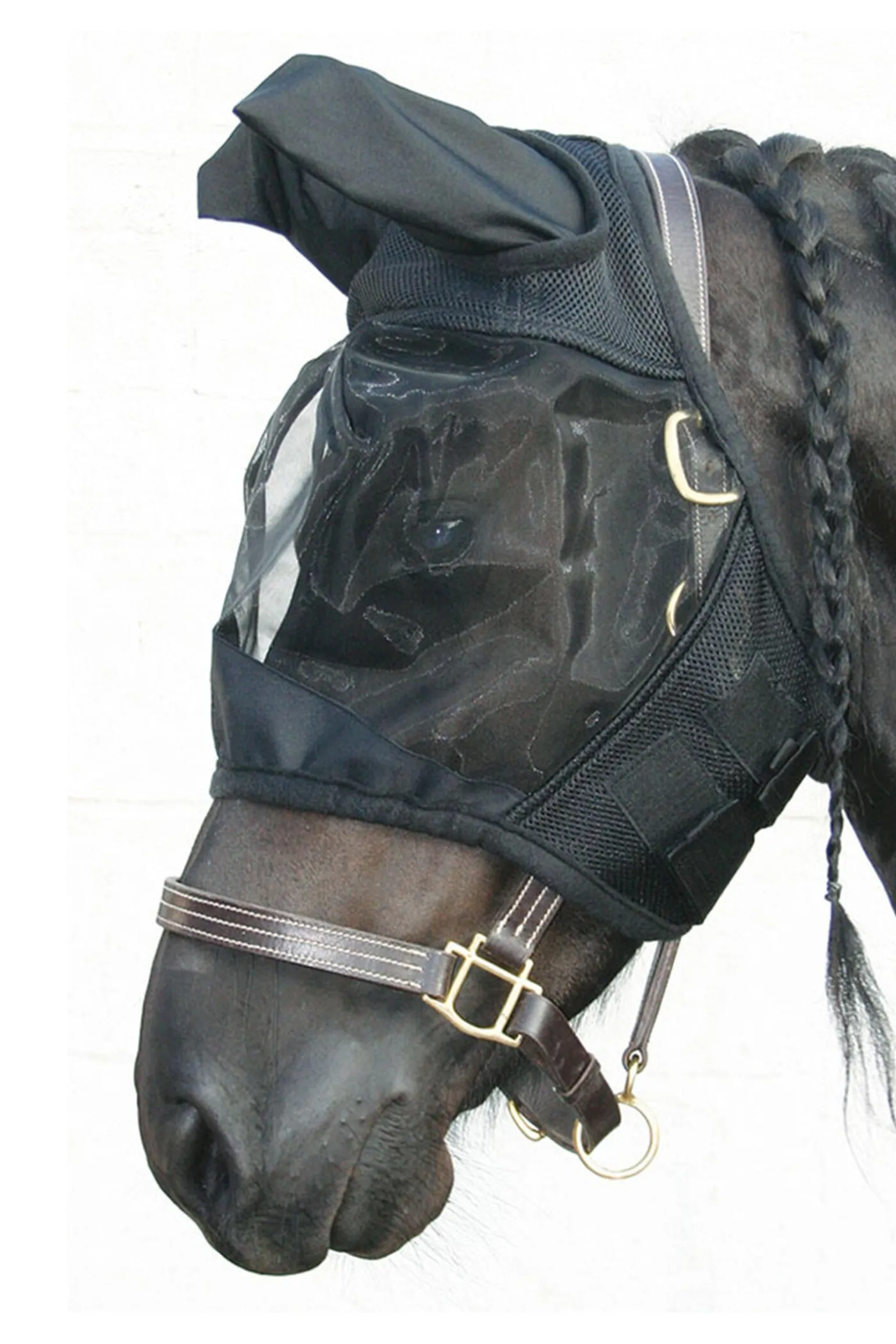 Fliegenmaske mit ausgestellten Nähten, um die Augen und Wimpern freizuhalten. Aus Netz und Lycra mit Fleecebesatz.