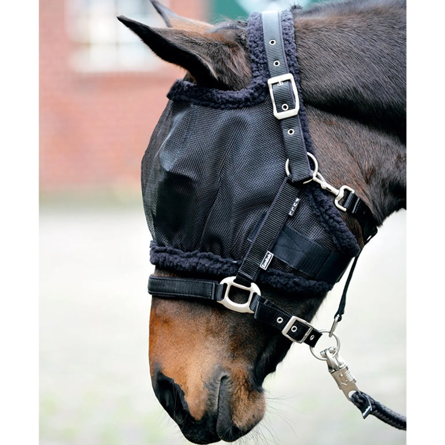 Fliegenmasken ohne Ohren aus engmaschigen festem Netzgewebe. Mit Klettverschluss, verstellbar. Elastischer Bund mit Einfassung aus Kunstlamm, dadurch sehr enganliegend am Kopf.
