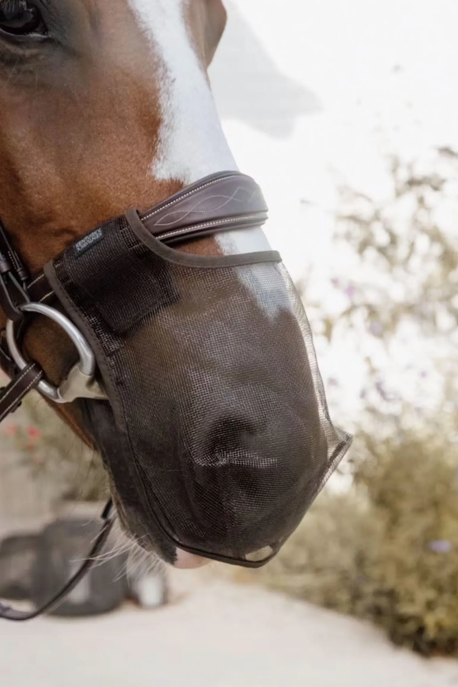 Der Anti-Fly-Nüsternschutz ist ideal für Pferde, die extrem empfindlich auf Insekten reagieren. Es kann sowohl im Training als auch auf dem Turnier eingesetzt werden. Das Netz stört weder das Gebiss noch die Atmung des Pferdes. Der Anti-Fly-Nüsternschutz kann sowohl beim Ausritt als auch im Stall in Kombination mit einem Halfter verwendet werden. Der Nüsternschutz ist aus einem widerstandsfähigen Netz gefertigt, das keine Insekten durchlässt, aber dennoch hoch atmungsaktiv ist. Es wird mit 2 Klettverschlüssen am Nasenriemen der Trense befestigt. Aufgrund der anatomischen Form des Anti-Fly-Nüsternschutzes lässt es sich leicht mit verschiedenen Arten von Nasenriemen und Halftern kombinieren.