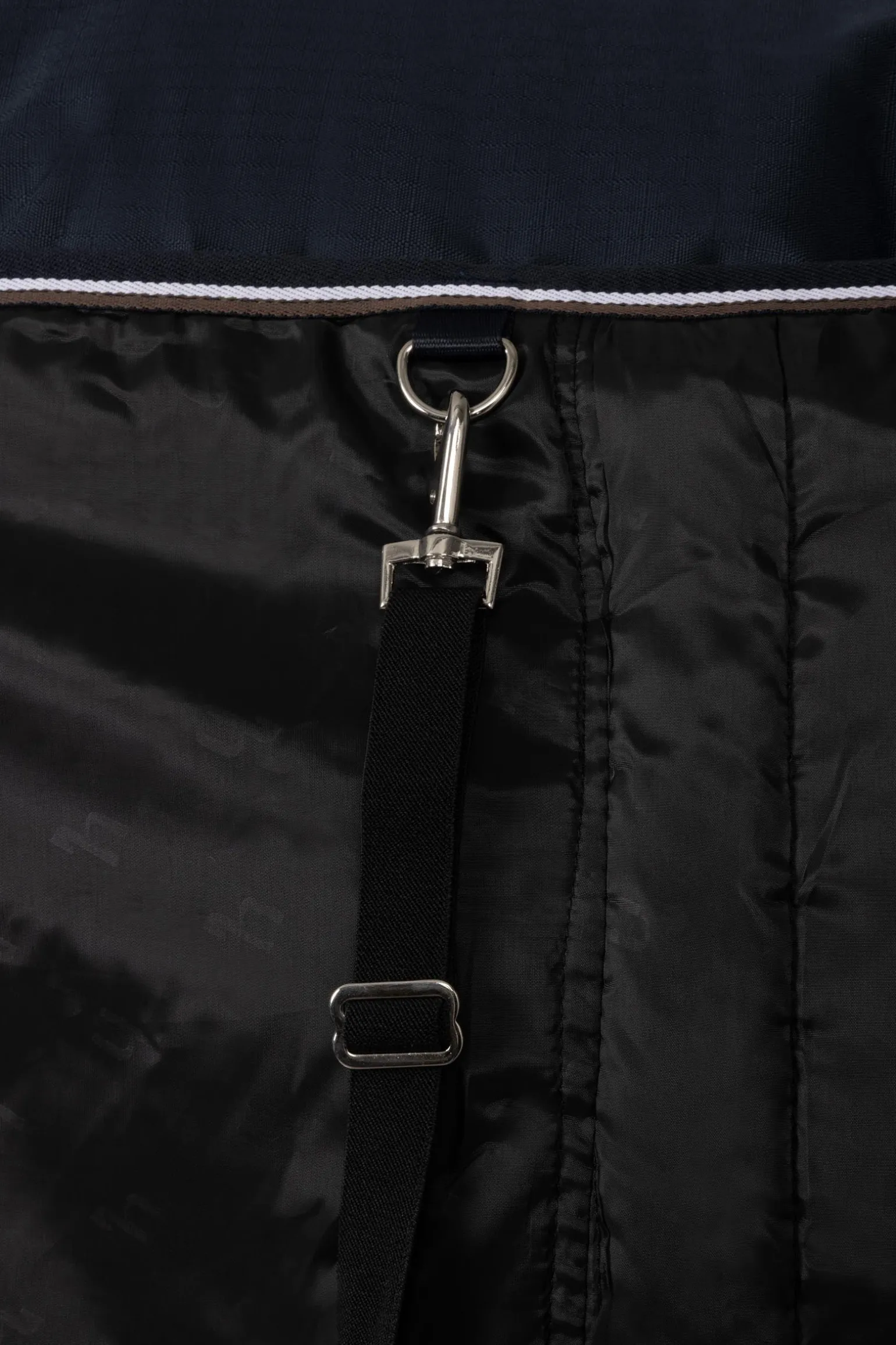 Die Regendecke mit Halsteil besteht aus wasserdichtem, atmungsaktivem Material. Die gute Passform an Hals und Schultern sorgt für Komfort, die hohe Gehfalte für Bewegungsfreiheit. Die Brustverschlüsse, Kreuzriemen, Beinschnüre und der Schweiflatz halten die Decke sicher an ihrem Platz.