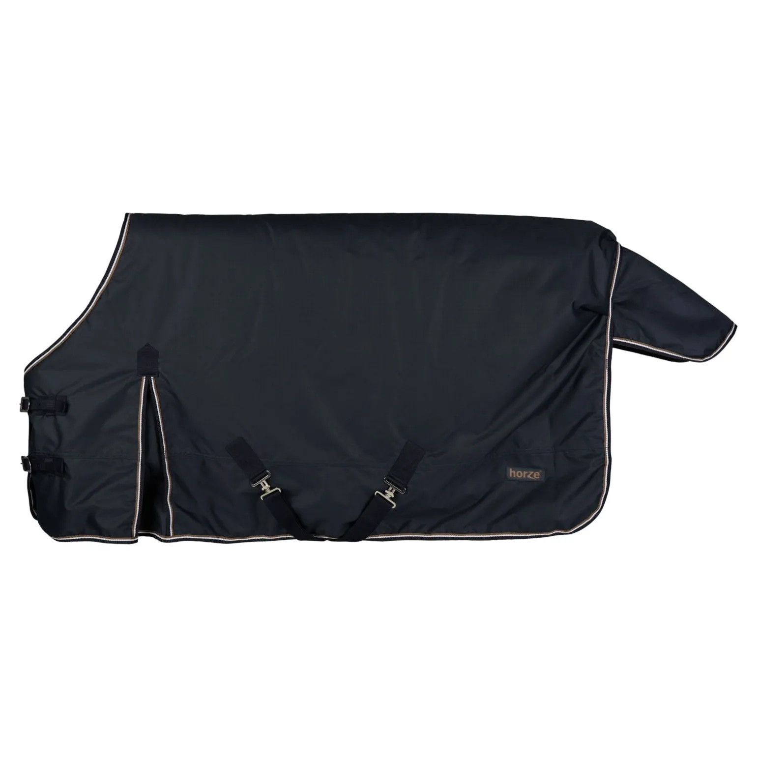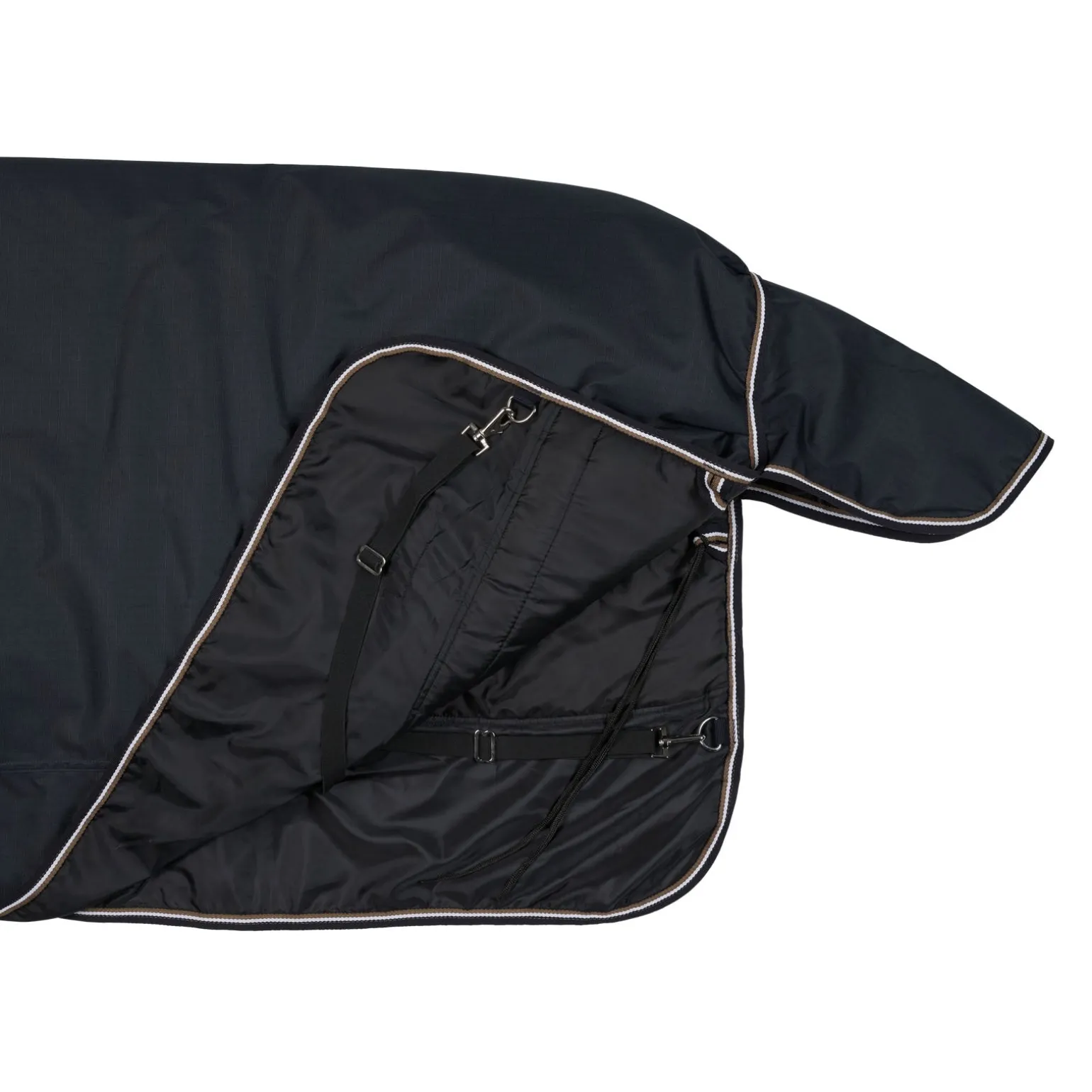 Diese Decke besteht aus wasserdichtem, atmungsaktivem Material. Die gute Passform an Hals und Schultern macht sie bequem und die hohe Gehfalte sorgt für Bewegungsfreiheit. Frontverschlüsse, Kreuzgurte, Beinschnüre und Schweiflatz sichern die Decke und bieten vollen Schutz.