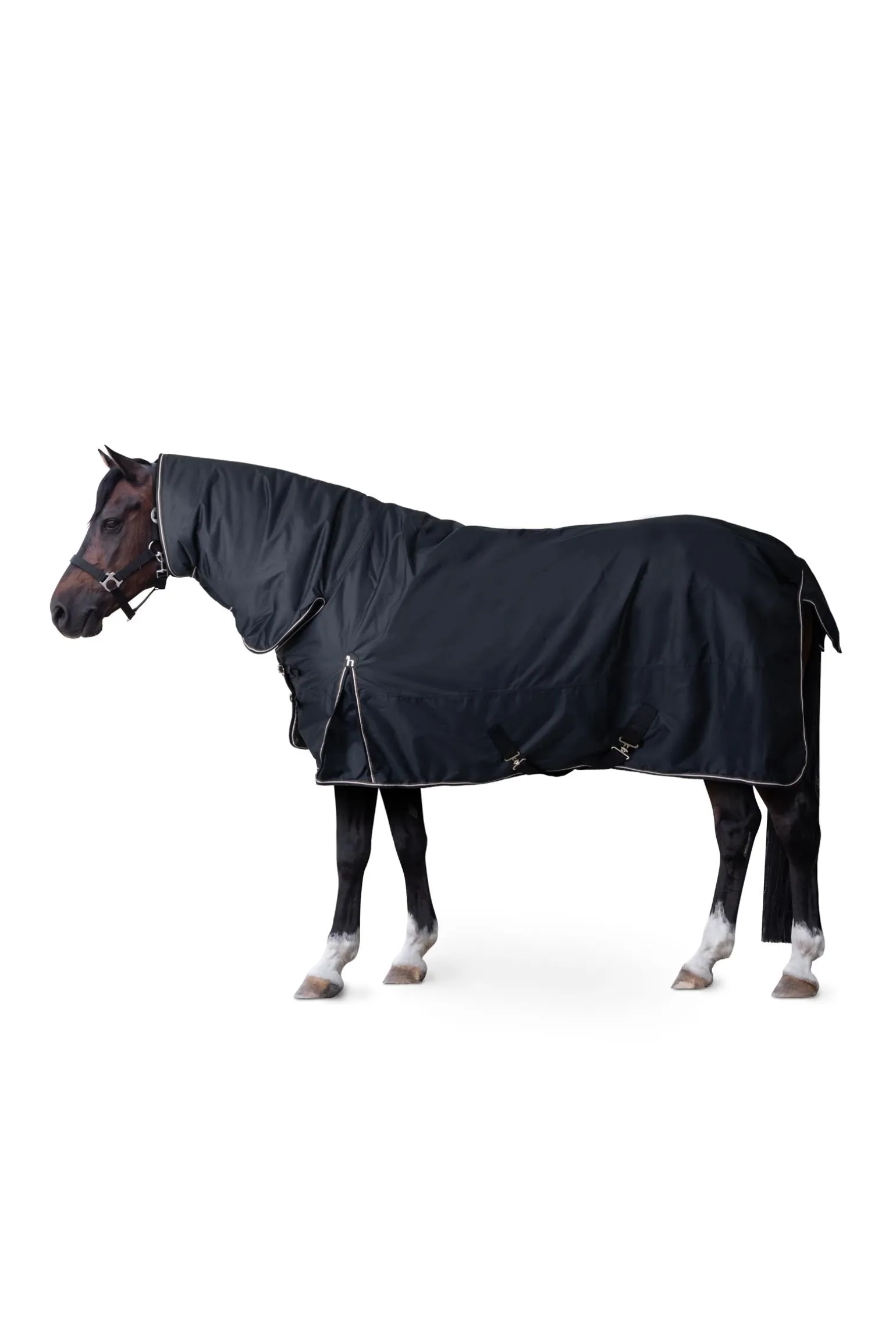Diese Decke mit Halsteil besteht aus wasserdichtem, atmungsaktivem Material. Die gute Passform an Hals und Schultern macht sie bequem und die hohe Gehfalte sorgt für Bewegungsfreiheit. Frontverschlüsse, Kreuzgurte, Beinschnüre und Schweiflatz sichern die Decke und bieten vollen Schutz.