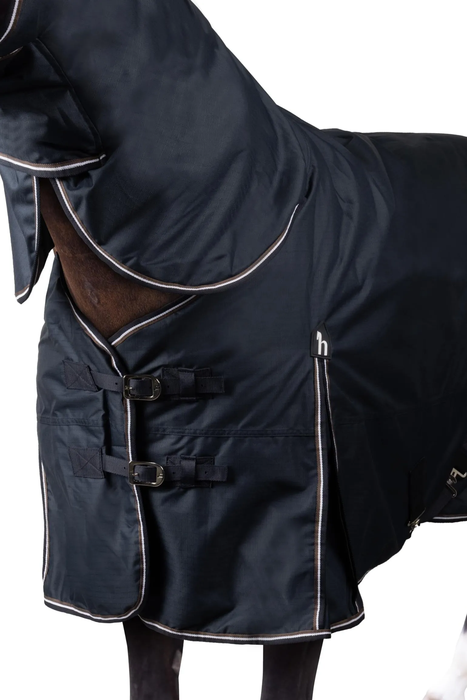 Diese Decke mit Halsteil besteht aus wasserdichtem, atmungsaktivem Material. Die gute Passform an Hals und Schultern macht sie bequem und die hohe Gehfalte sorgt für Bewegungsfreiheit. Frontverschlüsse, Kreuzgurte, Beinschnüre und Schweiflatz sichern die Decke und bieten vollen Schutz.