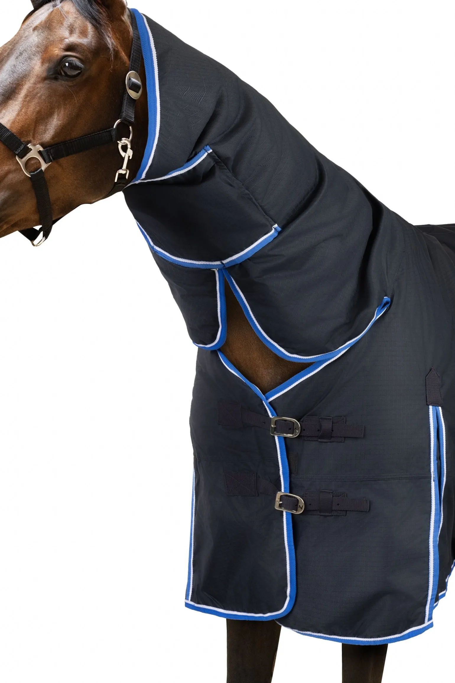 Diese Decke mit Halsteil ist aus wasserdichtem, atmungsaktivem Material gefertigt. Der gute Sitz an Hals und Schultern macht sie bequem und die hohen Gehfalten bieten Bewegungsfreiheit, damit sich dein Pferd austoben kann und nicht eingeschränkt wird. Frontverschlüsse, Kreuzgurte und Beinschnüre halten die Decke sicher an ihrem Platz und verhindern Verrutschen.