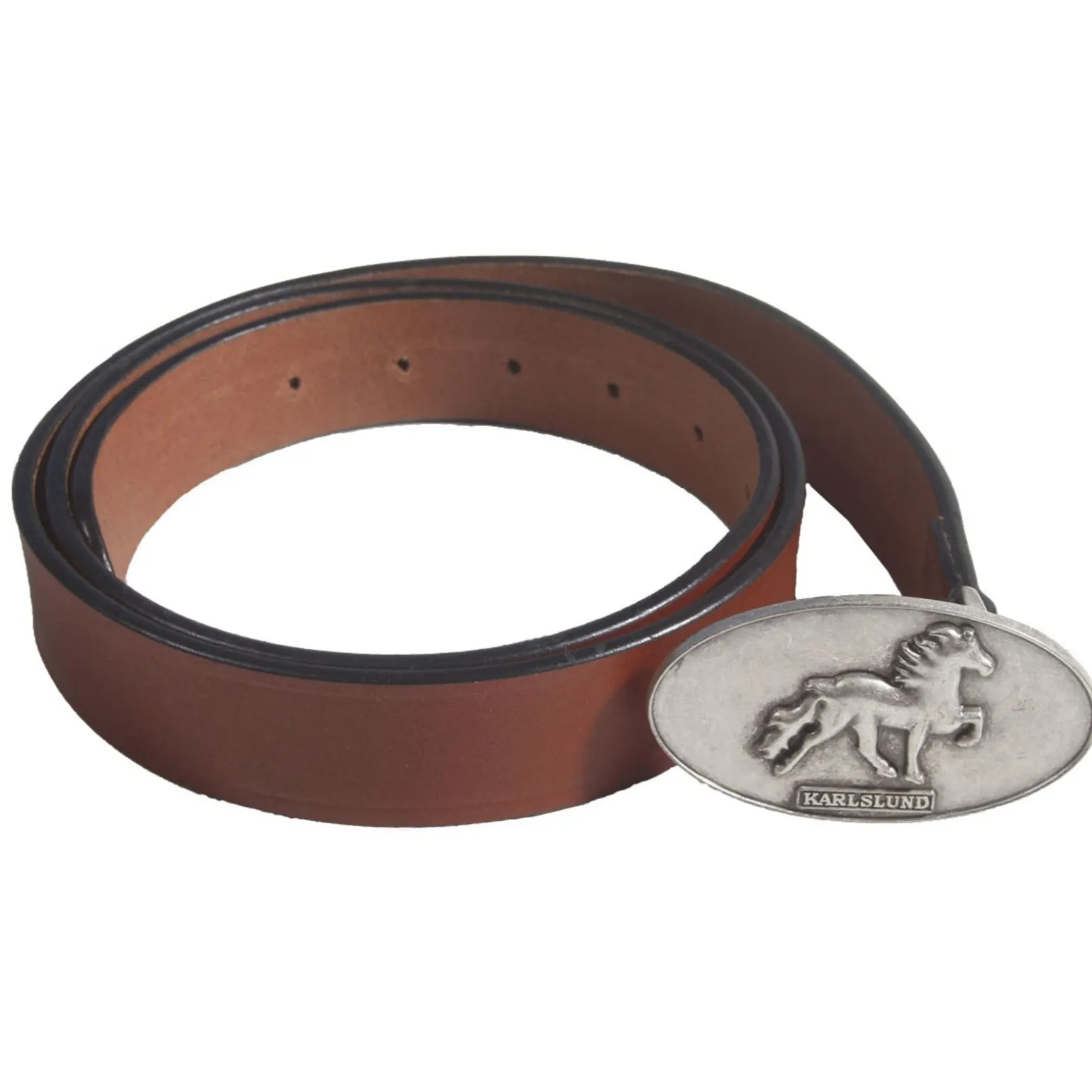 Schöner Gürtel aus gutem Qualitäts-Leder mit wunderschönem, rustikalen Islandpferde-Design auf der Schnalle. Passt zu Karlslund Reithosen.