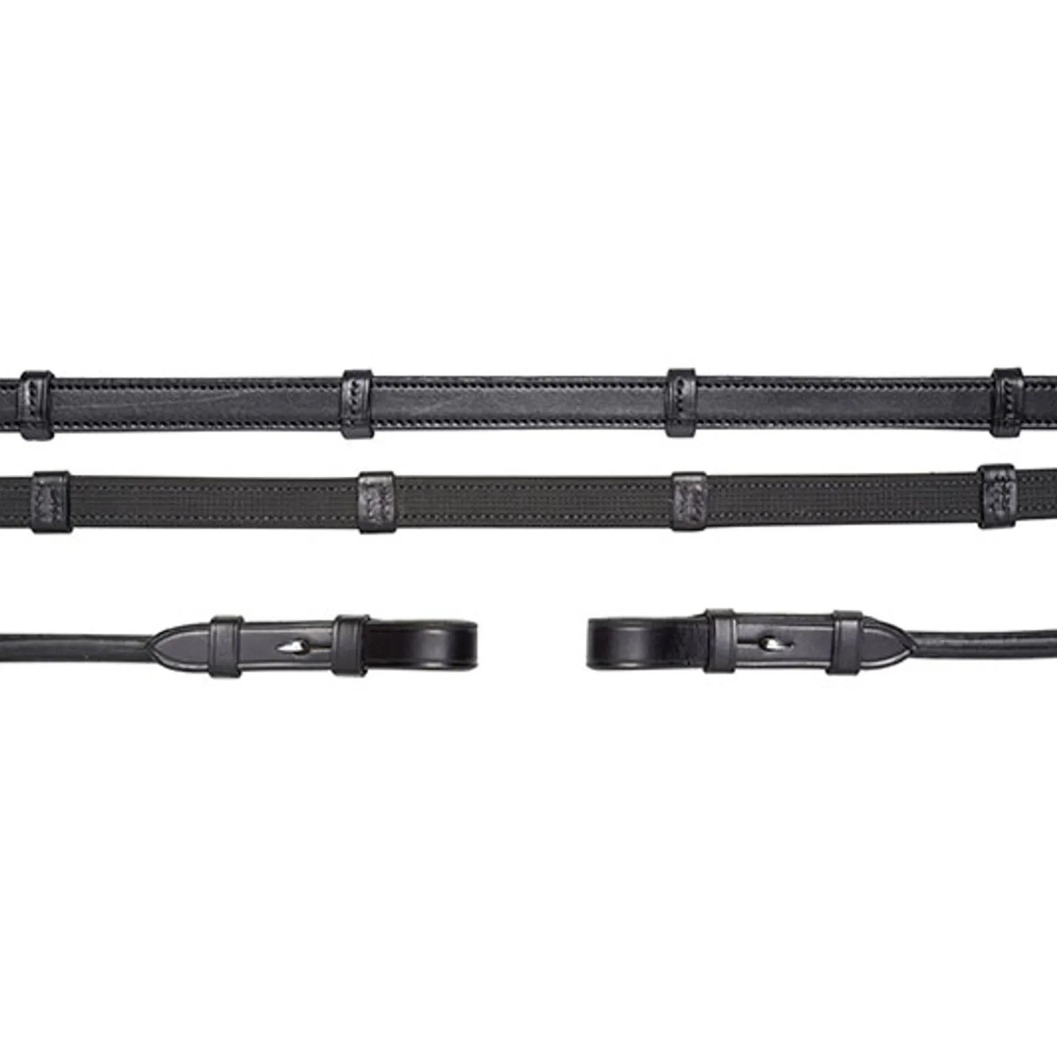 Rundgenähte Trensenzügel mit Zaumhaken. Die Zügel sind aus Leder und gummiert.