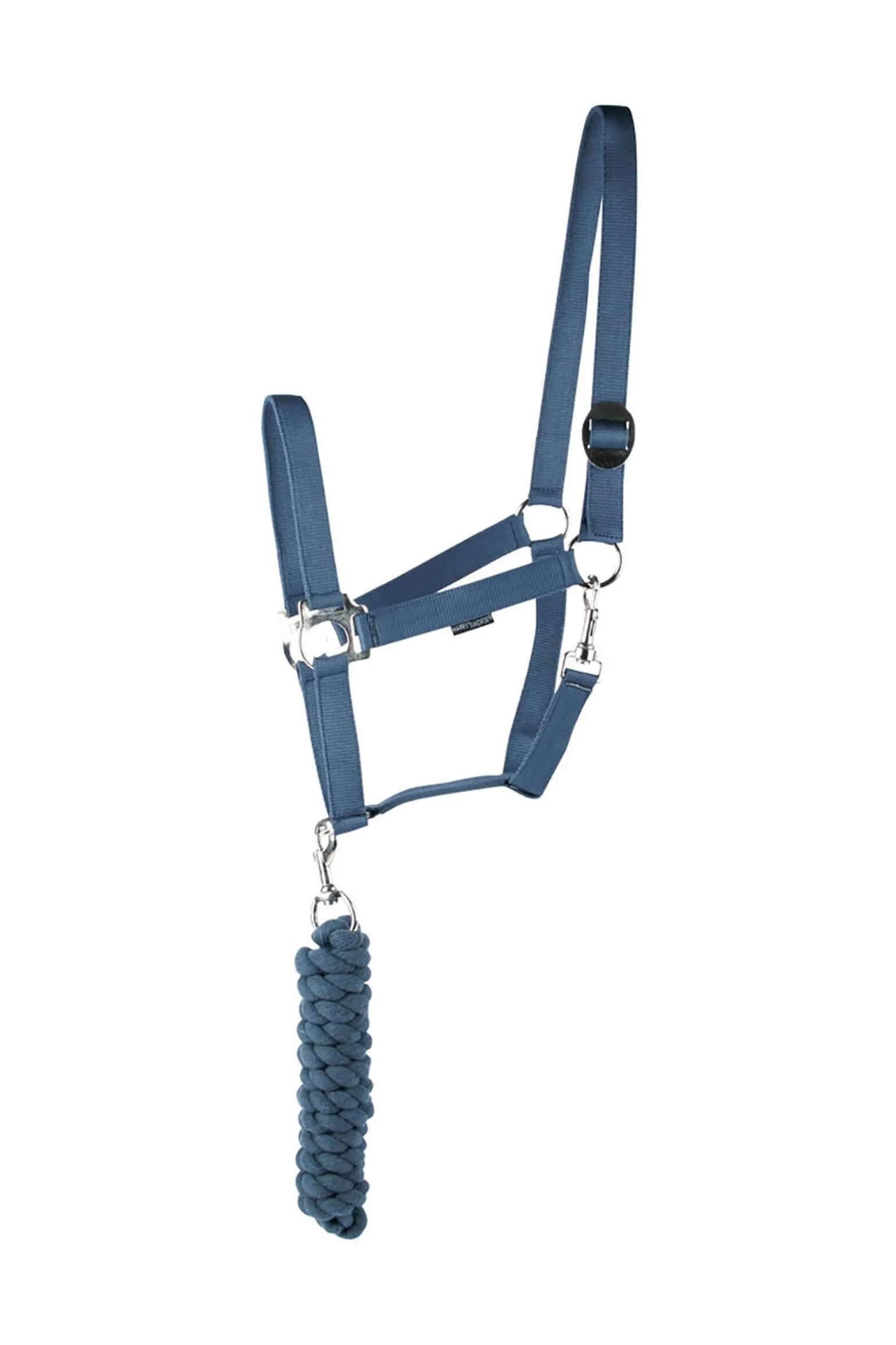 Basis-Halfter mit vernickelten Beschlägen. Das Halfter ist am Kopfstück mittels Schiebeschnalle verstellbar. Länge Führstrick: 180 cm.