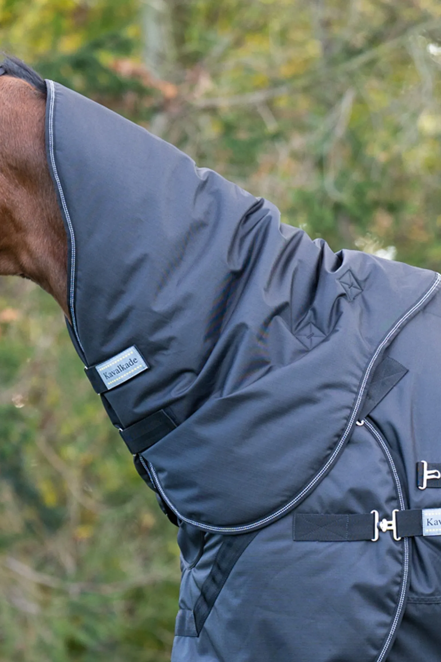 Das passende Halsteil zur Weide- und Führanlagendecke Halifax 2in1. Das Halsteil „Halifax“ hat eine ideale Passform und hält durch die 50 g Fütterung mit Watte den Hals des Pferdes angenehm warm. Wie die Decke ist auch das Halsteil wind- und wasserfest sowie atmungsaktiv (4000 mm Wassersäule, Atmungsaktivität 3000 g/qm). Um ein Verrutschen zu vermeiden, sind an dem Halsteil jeweils zwei Klettverschlüsse an der Seite und zwei an der Halsunterseite angebracht.
