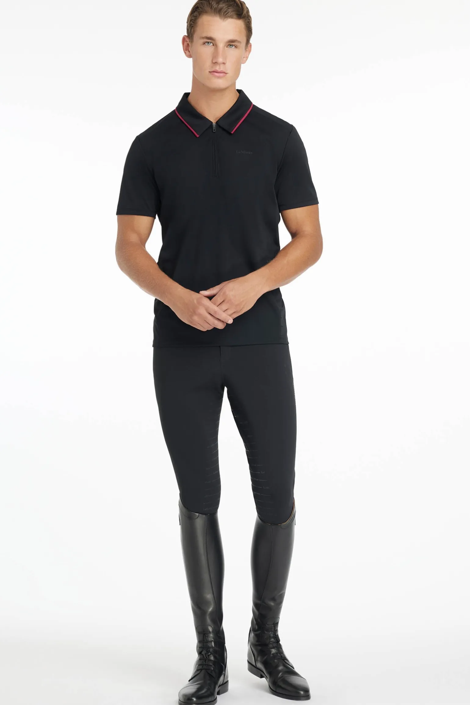 Ein großer Mesheinsatz in der Rückenmitte, der sich über die Seiteneinsätze erstreckt, sorgt dafür, dass der Luftstrom an die Bereiche gelangt, die besonders beansprucht werden. Edle Details, wie paspelierte Kanten, ein Reißverschluss am Kragen und ein geschwungener Saum, sorgen dafür, dass – egal, ob auf oder neben dem Pferd – alle Blicke auf dich gerichtet sind.