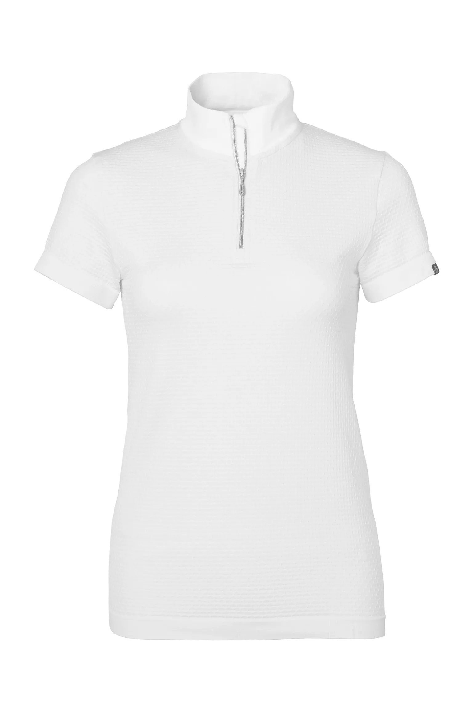 Feminines, nahtloses, turniertaugliches Tech-Top mit einem weißen Kragen.