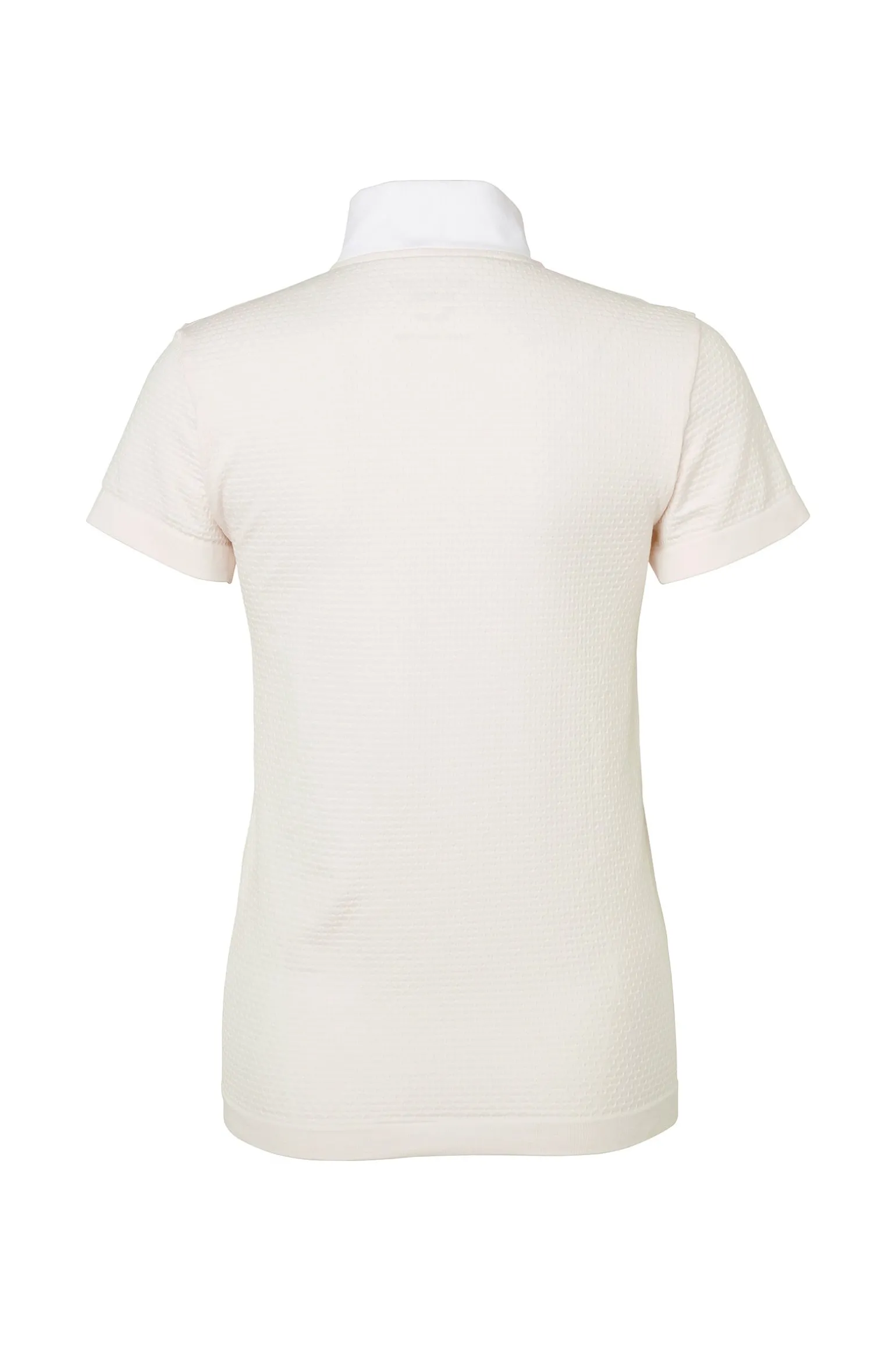 Feminines, nahtloses, turniertaugliches Tech-Top mit einem weißen Kragen.