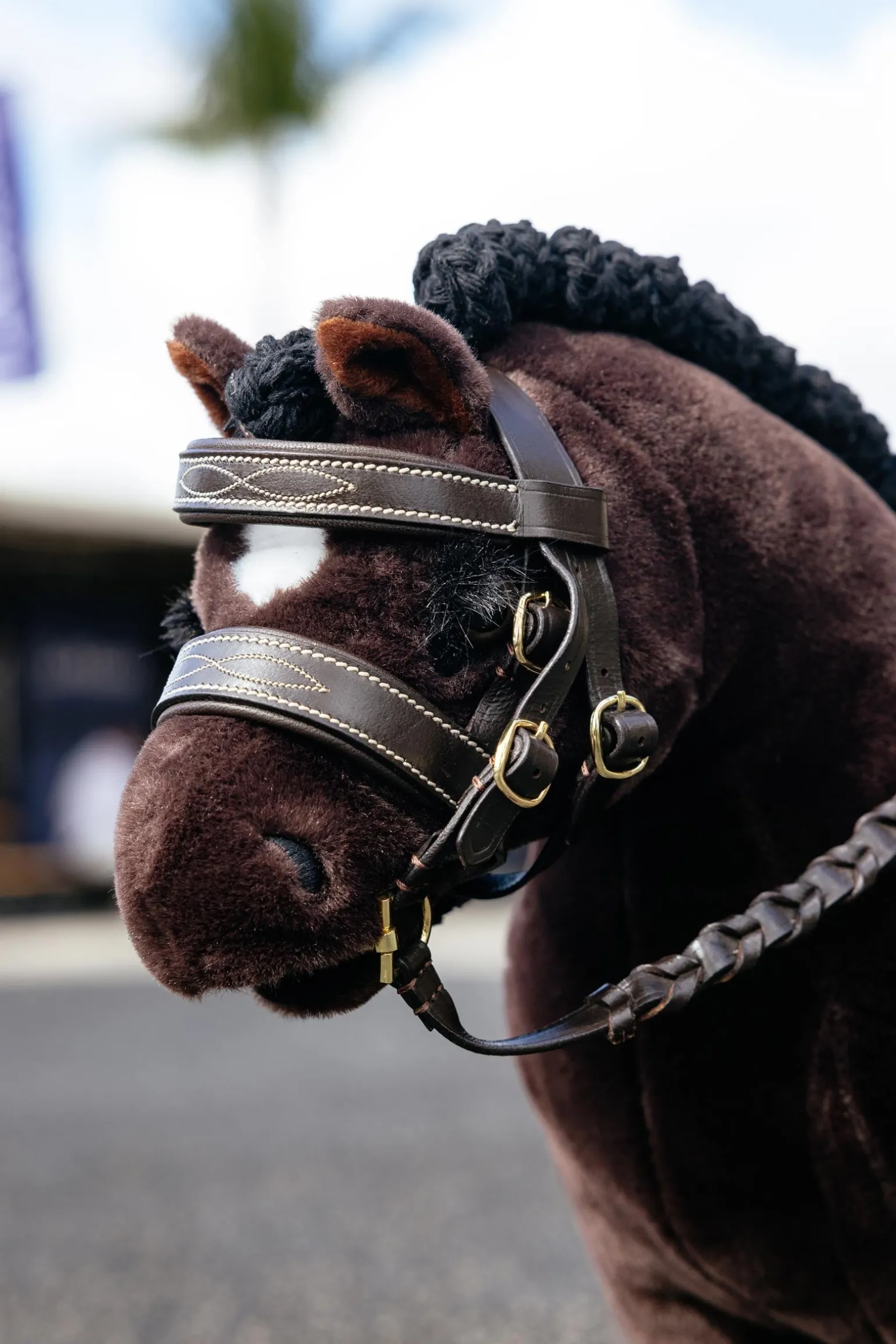 Realistische Trense, inspiriert von der Hunter-Trense für echte Pferde, mit Stickerei, D-Ring-Gebiss, funktionalen Schnallen und geflochtenen Zügeln. Ein großer Auftritt für kleine Spielzeugponys.