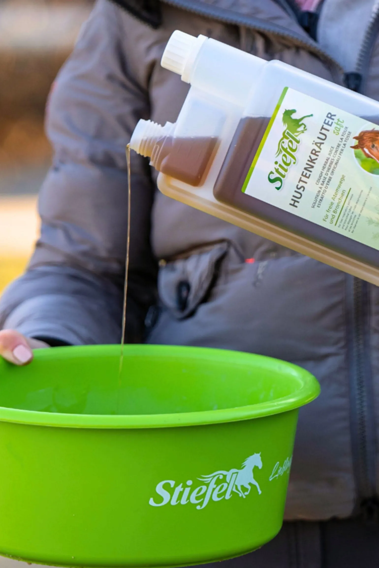 Stiefel Hustenkräutersaft ist ein Kräutersaft aus einer natürlichen Kräutermischung ohne künstliche Aromastoffe zur Unterstützung von Atemwegen und Bronchien bei haltungs- und fütterungsbedingter Beanspruchung der Atemwege. Die enthaltenen Kräuter können sich positiv auf den Atmungsapparat auswirken und sind auch zur längerfristigen Gabe geeignet. Hinweis: Anwendung bei trächtigen Stuten nur in Rücksprache mit dem Tierarzt. Stiefel Kräutersäfte sind vegan, ohne Zuckerzusatz, ohne Farbstoffe, ohne künstliche Aromastoffe und made in Germany. Fütterungshinweis: Pferde (600 kg KGW) 70 ml / tägl., Kleinpferde 35 ml / tägl. Tagesdosis kann auf zwei Portionen pro Tag aufgeteilt werden. Fütterungsdauer: Mind. 14 Tage. Fütterungsdauer von bis zu 6 Wochen empfehlenswert.